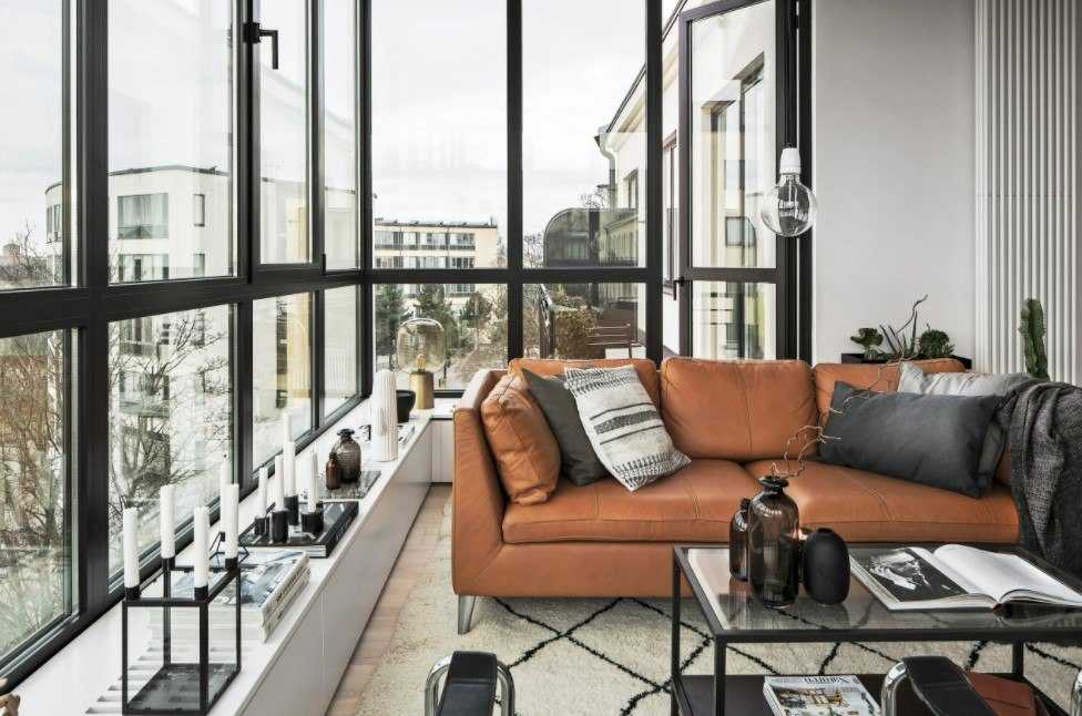 Для экономии стоит обратить внимание на угловой кожаный диван. Он займет свободный угол и тем самым сэкономит пространство.