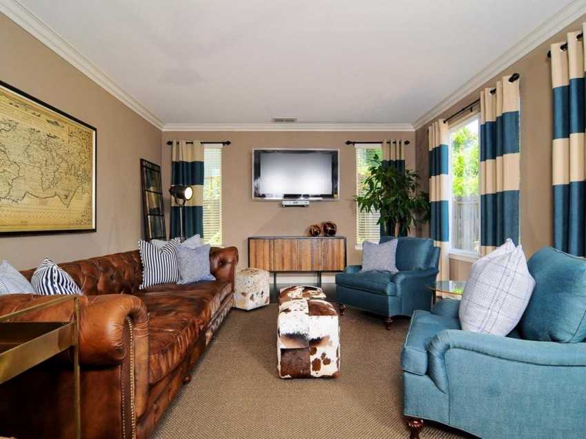 Как мы уже говорили, мебель в гостиной должна обязательно сочетаться со стилем интерьера, а кожаный диван и кресла – это чудесная возможность подчеркнуть особенность того или другого направления в дизайне.