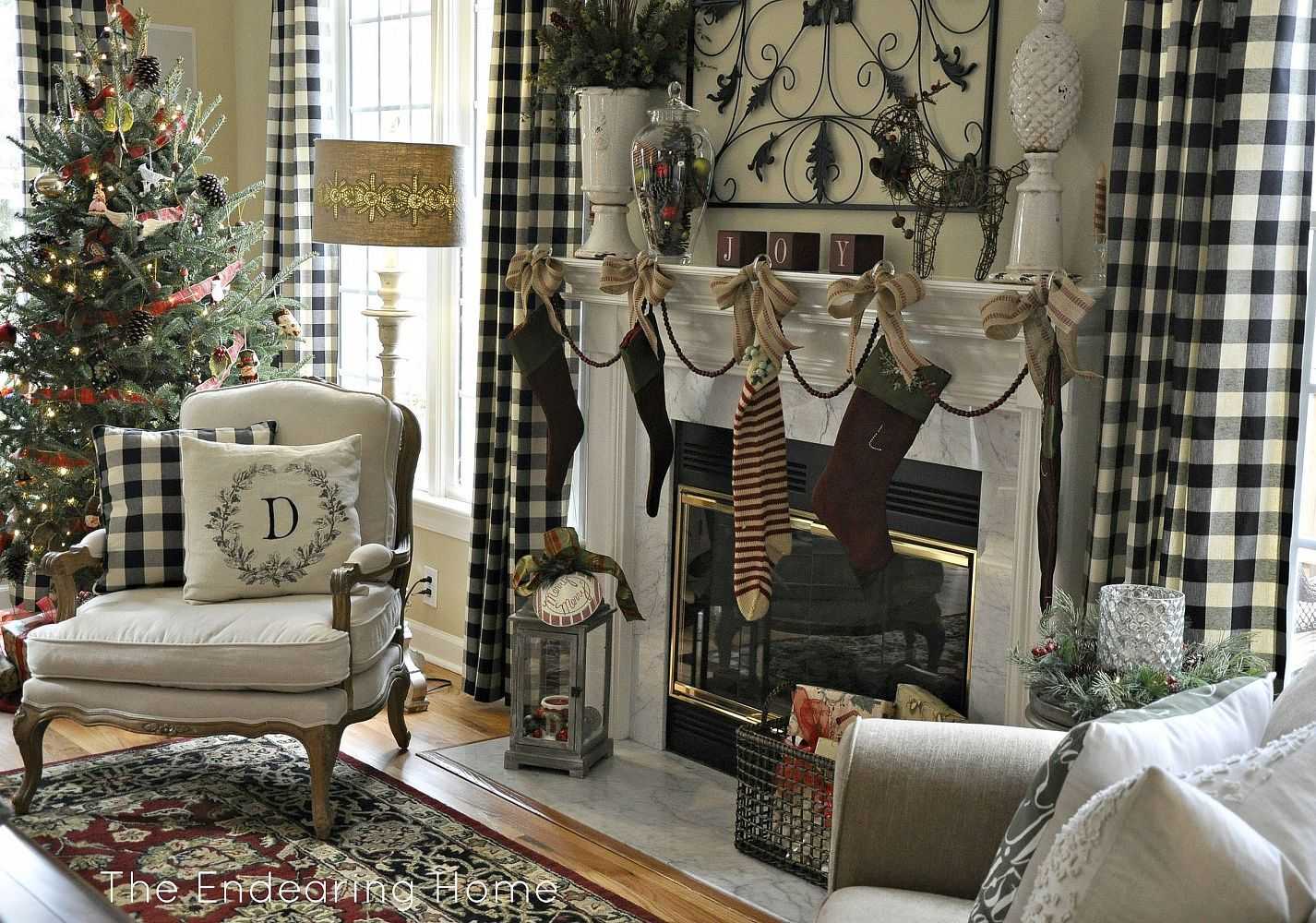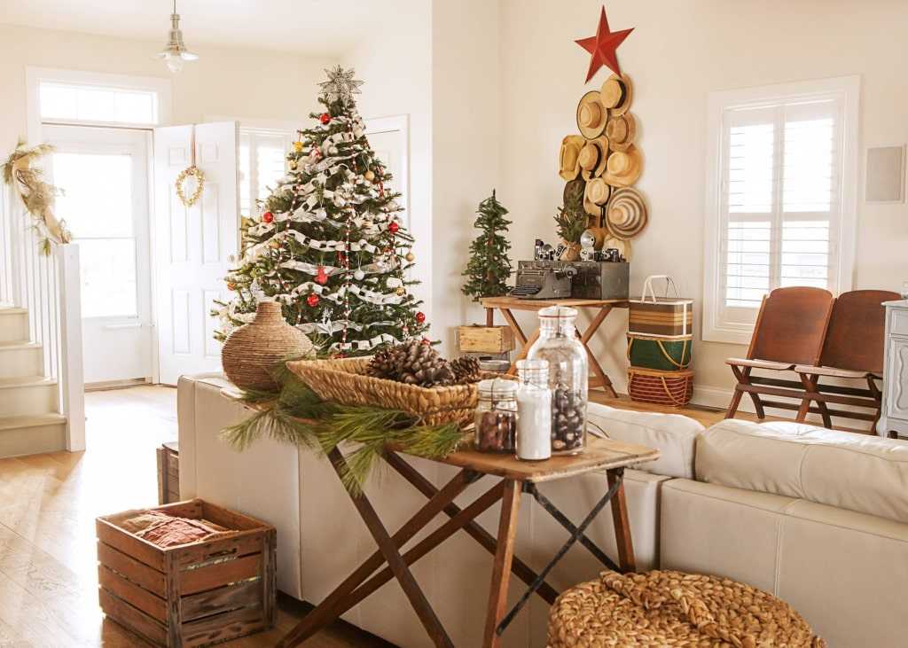 В целом кантри предполагает использования декора, сделанного своими руками. Поэтому можно смело приступать к созданию вязаных игрушек, гирлянд, деревянных предметов и т.д. Примечательно, что в данном оформлении уместным будет и съедобный декор. Это может быть печенье, пряники, сушеные апельсиновые и лимонные дольки, а также целые фрукты и ягоды. Ну и, конечно же, зеленые хвойные композиции – незаменимый предмет новогоднего декора комнаты.
