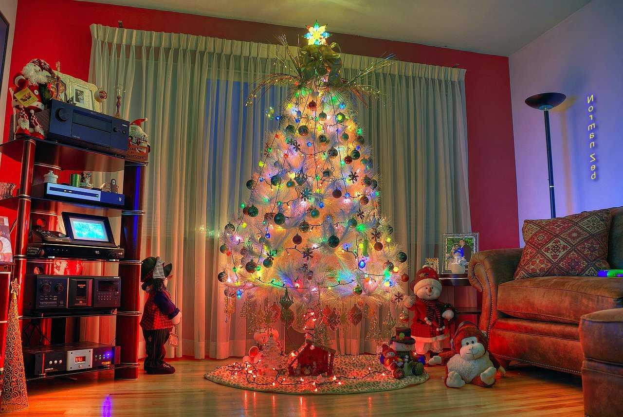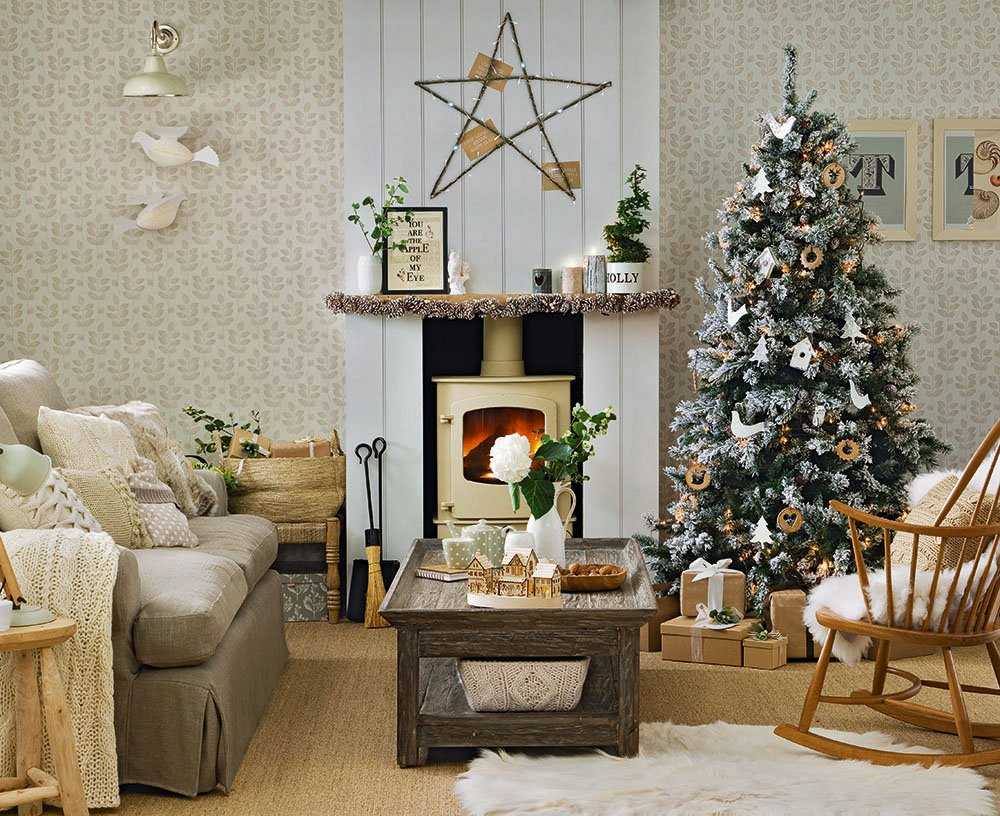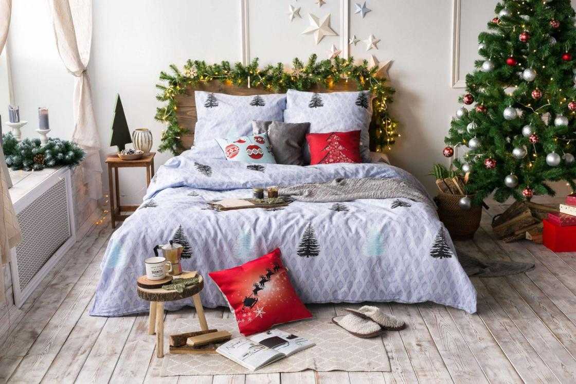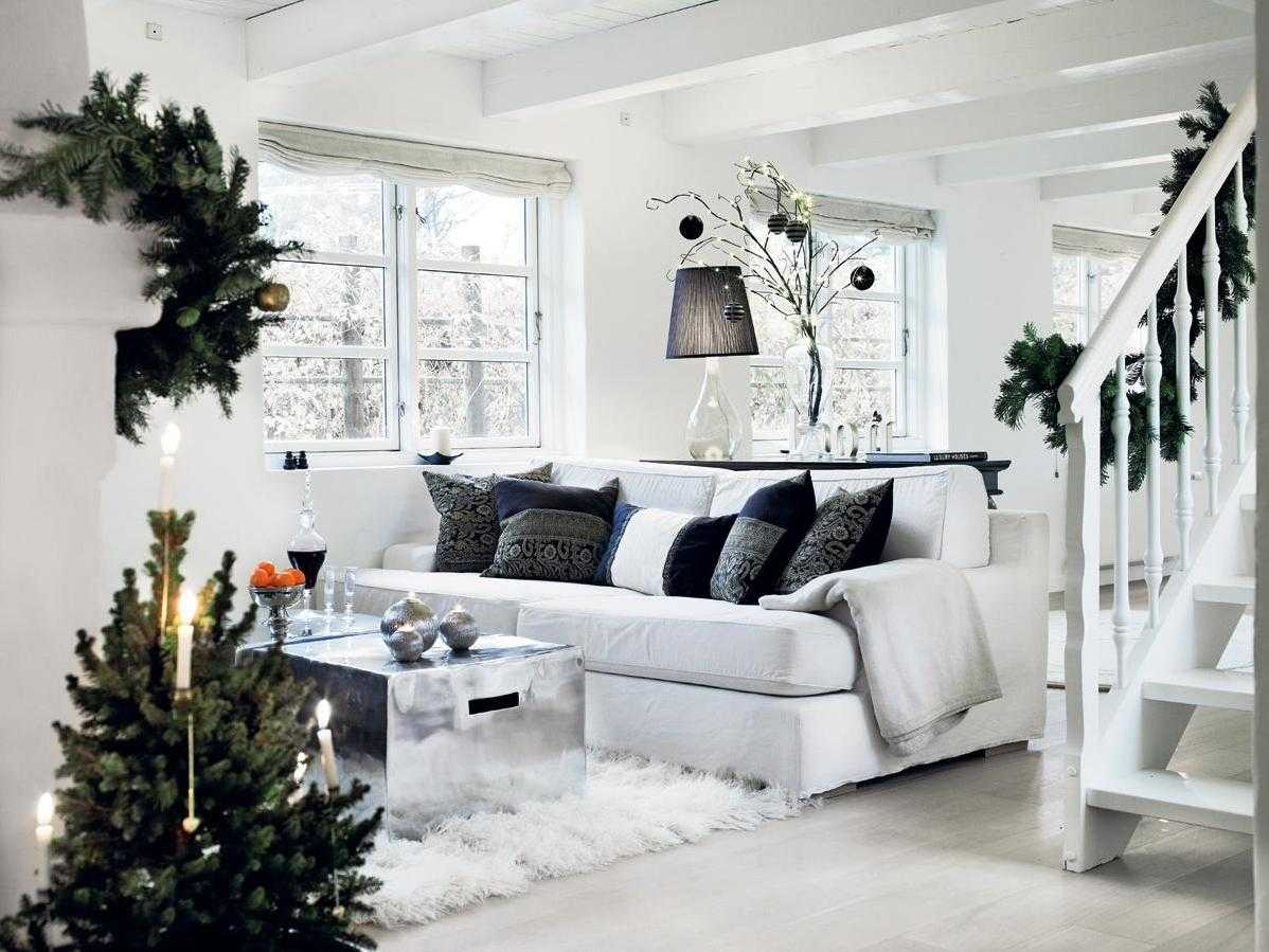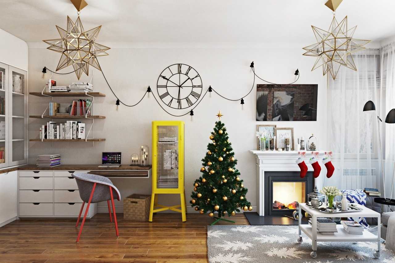 Пожалуй, один из самых стильных вариантов оформления комнаты является скандинавский стиль. Он отличается преимущественно холодными оттенками, а также натуральными материалами и сдержанностью оформления. В контексте Нового года речь идет об отсутствии разноцветной мишуры и других деталей. То есть в случае, если вы приняли решение оформить комнату к Новому году в скандинавском стиле, то лучше взять за основу белый цвет. Установите белую елку или же просто украсьте ее серебристой гирляндой.