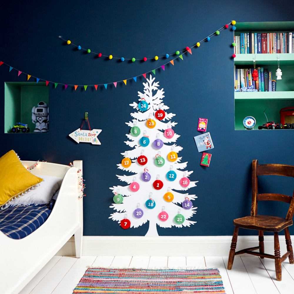 Что касается стен и потолка, то их оформление не должно быть слишком активным. Впрочем, если вы не планируете устанавливать елку, можно сделать ее на одной из стен. Она может выглядеть совершенно по-разному, в зависимости от выбранных материалов. В основном елку делают из деревянных палок, веток, мишуры и даже бумаги. Каждый вариант смотрится по-своему интересно, поэтому выбирайте тот, что вам по душе.
