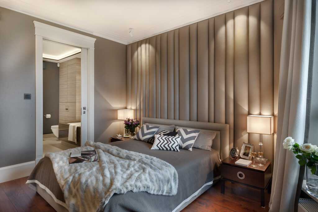 Классическая спальня экрю — это интерьер, в котором есть место для нежных темно-коричневых и черных элементов. Черные ручки шкафов, черные тонкие рамы для картин, темно-коричневые цоколи ламп (в сочетании с кремовыми абажурами), деревянный пол или даже коричневое постельное белье на кровати идеально сочетаются с кремовыми стенами, покрывалом или ковром.