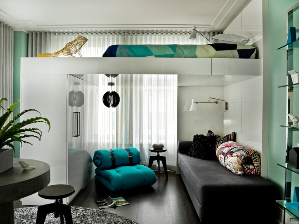 Второй вариант отлично подходит для семейных пар, особенно для тех, кто приобретает первое в жизни жилье, весьма скромное по площади, например как эта студия в современном стиле. Такие двуспальные кровати могут напоминать своего рода мини-отель: мягкий широкий матрас, полочки для книг и разных мелочей, отличное освещение, яркие панно или картины, прочий приятный взору декор. Некоторые пары даже устраивают на втором ярусе маленькое рабочее место, если им приходится ютиться в совсем уж миниатюрной квартирке.