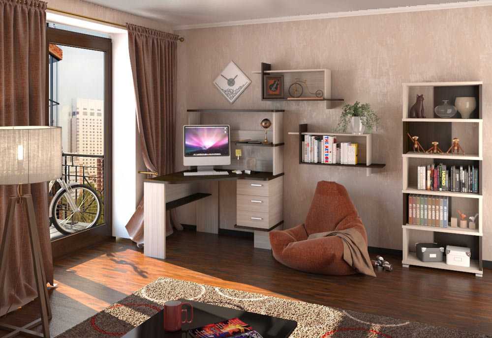 Рабочая зона. Отделить ее от зоны отдыха можно стеллажом или книжной этажеркой. Разместить в ней рекомендуется письменный или компьютерный стол, повесить полки на стену.