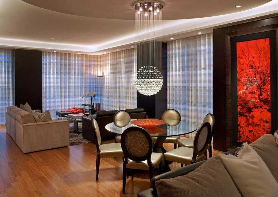 Нередко с помощью люстр осуществляется зонирование пространства, расставляются световые акценты.