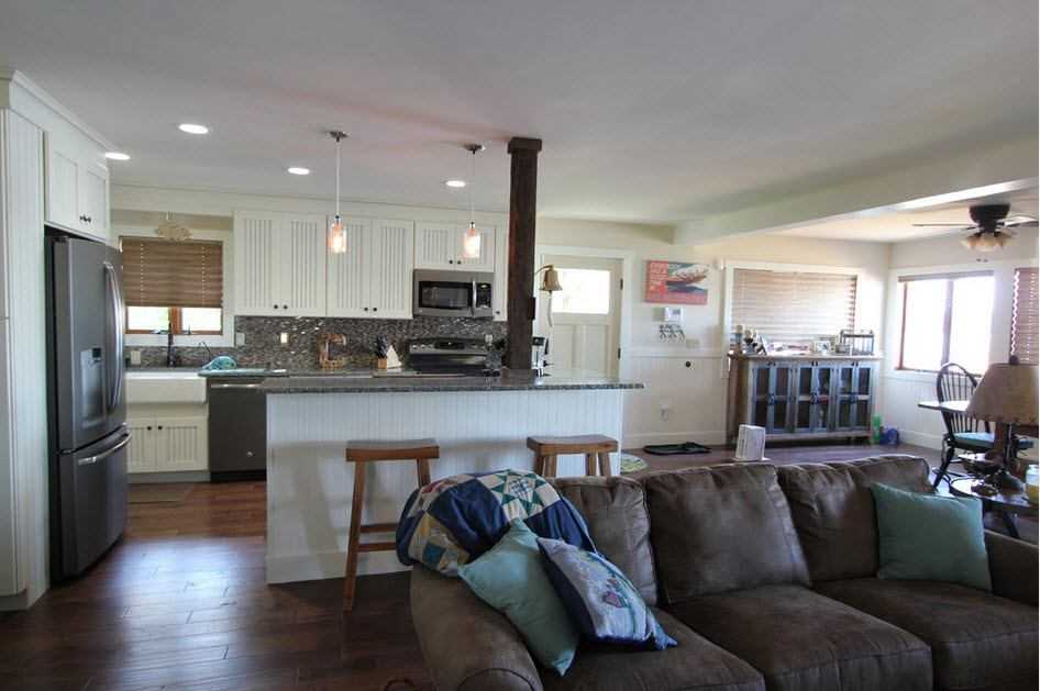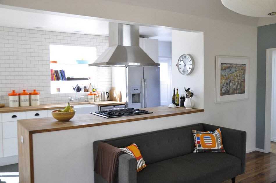 Здесь диван может служить полноценным местом отдыха, а не посадочным местом у стола. Очень часто его используют для визуального отделения кухни от зоны гостиной.