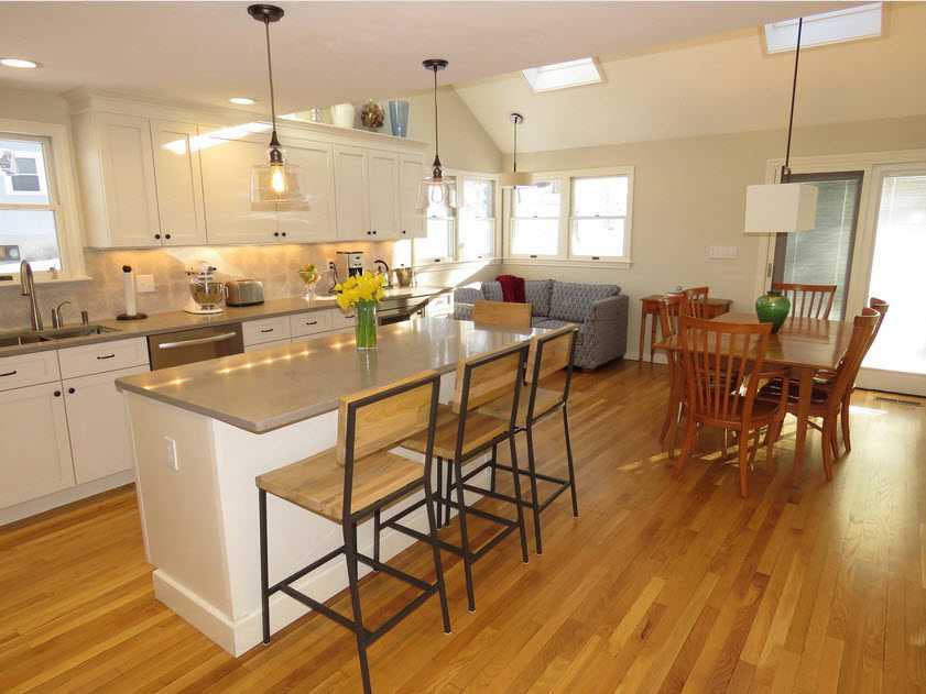 В первом случае лучше всего приобрести угловой диван, освободив для столовой группы угол напротив рабочей зоны. С вытянутой кухней дело обстоит сложнее. Вряд ли сюда можно будет поставить угловой диван, не рискуя загромоздить пространство, поэтому лучше выбирать прямые модели без массивных подлокотников или вовсе без них.