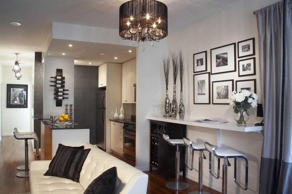 - Когда балконный проем демонтируют частично, оставшийся фрагмент стены используют как барную стойку. На балконе можно поставить небольшую софу или мягкую скамейку. Иногда на балкон выносят маленький столик и пару стульев, а диван оставляют на кухне.