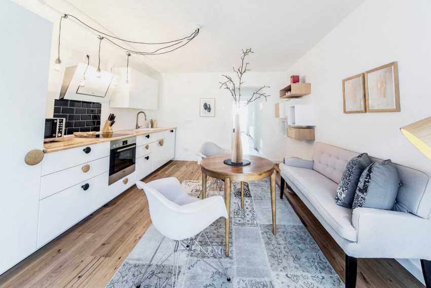 Дизайн маленькой кухни может быть очень разнообразным. Вариант с планировкой и расстановкой мебели с диваном может быть особенно функциональным. За счет наличия дивана или даже раскладного дивана (обычно подходят модели, которые раскладываются вперед) вы по сути получаете кухню-гостиную. Таким образом другие жилые комнаты могут остаться приватными и не иметь зоны для принятия гостей. Также стоит знать, что малогабаритная кухня может иметь мягкий кухонный уголок либо полукресла — часто такое решение даже более предпочтительно.