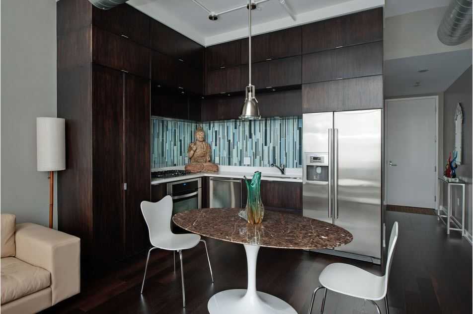 Что касается обеденной зоны, то для ее обустройства можно приобрести стеклянную мебель. Прозрачные конструкции будут создавать ощущение легкости, незагроможденности пространства.