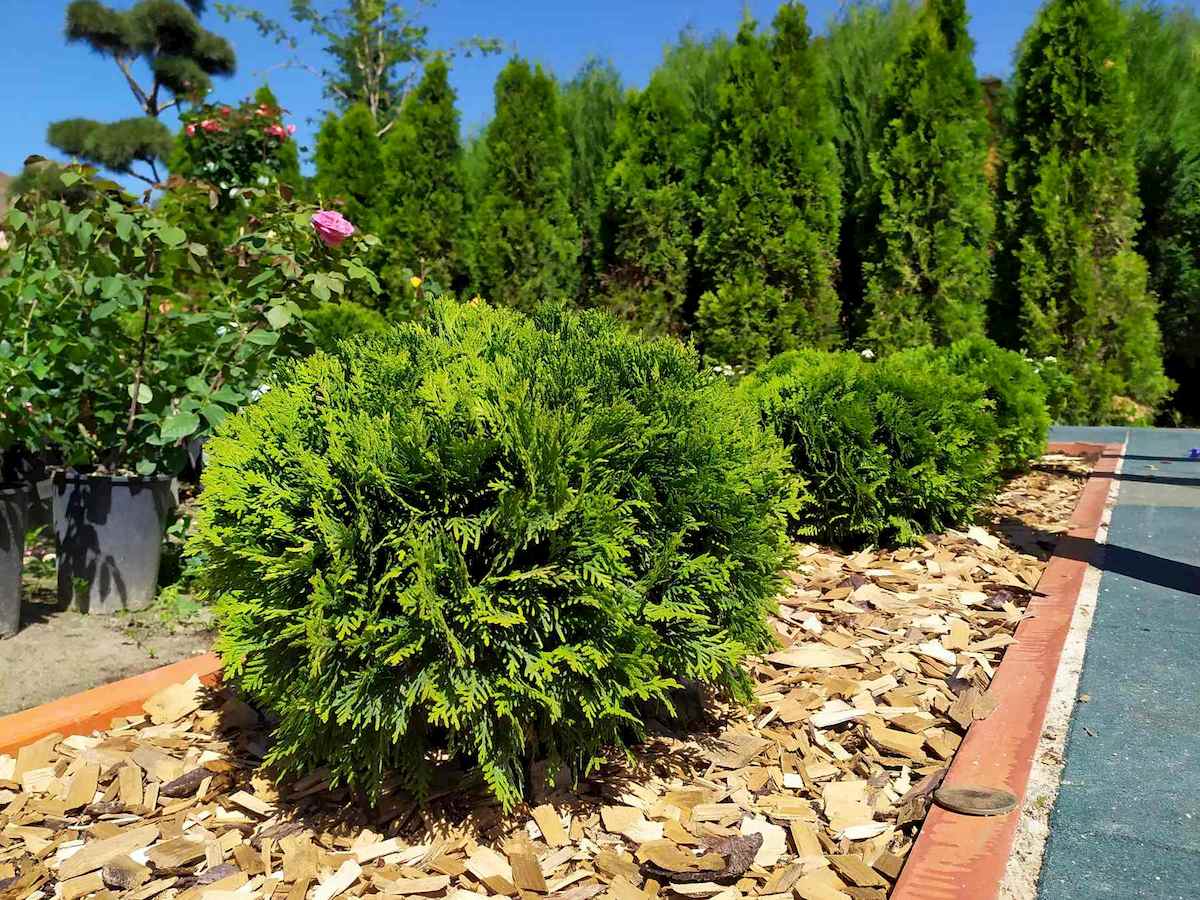 Туя представляет собой невысокий кустарник высотой около 1,5 метров или настоящее дерево до двух метров высотой. Это растение прекрасно смотрится как единственный акцент на клумбе, отмульчированной и покрытой отсыпкой из щебня или обсаженной газонной травой.