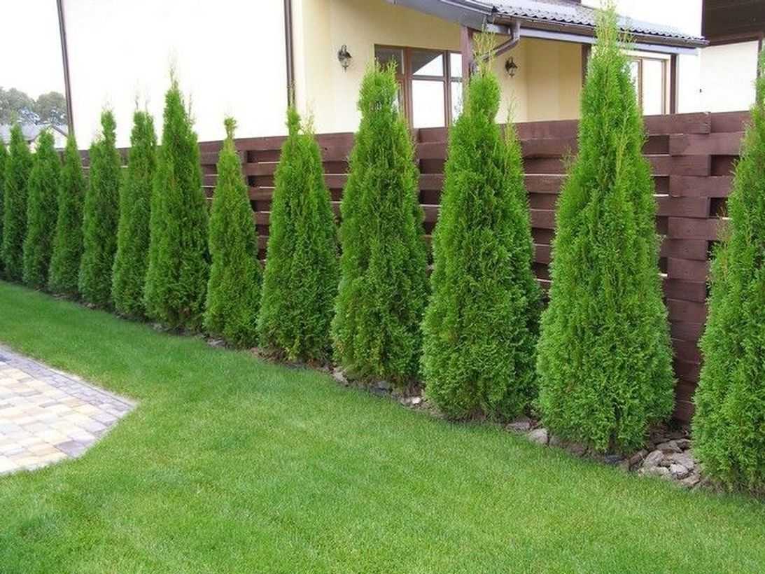 Горизонтальные сорта подходят ля создания живой изгороди. Если перед нею высадить розы или другие многолетники, то участок засияет новыми красками. Туя может представлять собой сплошную непроницаемую стену или невысокую подстриженную стенку.