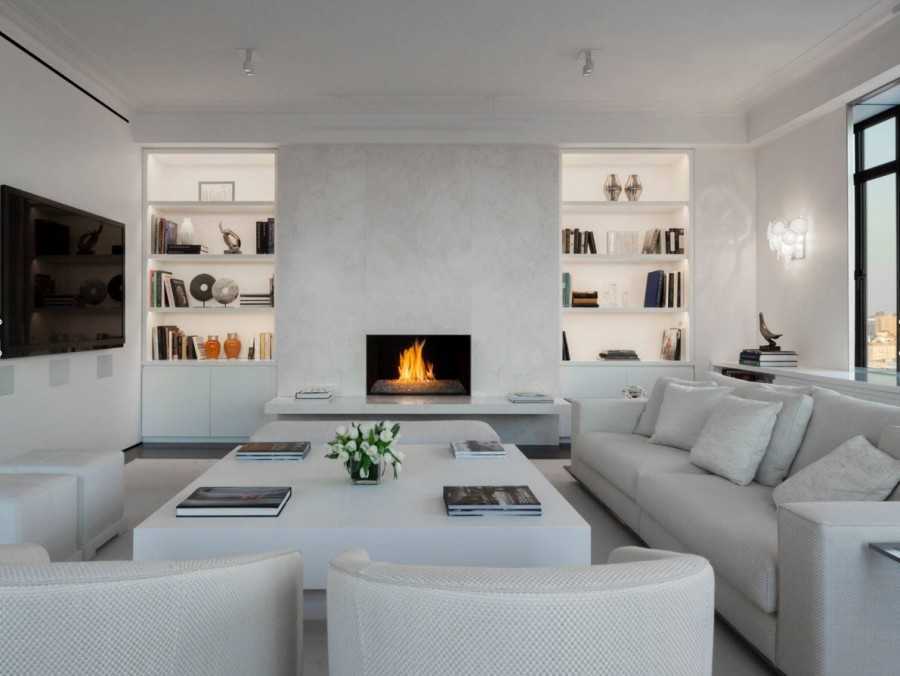 На фото интерьер гостиной в современном стиле с книжными полками геометрической формы, расположенными над камином.
