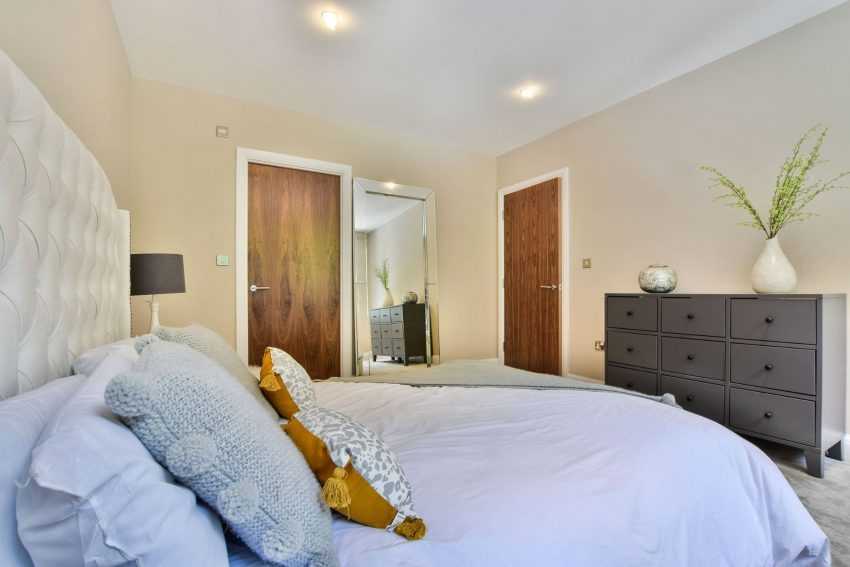 Основной предмет мебели, который должен находиться в центре комнаты — большая удобная кровать, поставленная изголовьем к стене.