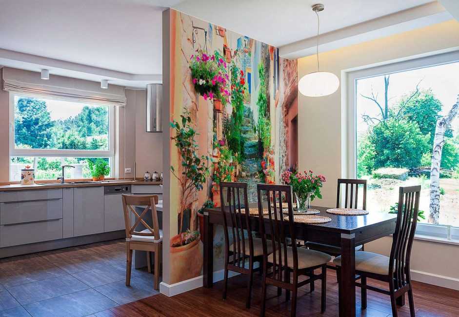 Некоторые решают использовать виниловый материал с шелкографией только для одной стены на кухне. Это касается помещений небольшого размера, обычно стена выбирается та, около которой сидят во время еды. Если кухня большая, разделенная на зоны для приготовления и отдыха, то использовать такие обои лучше во второй.