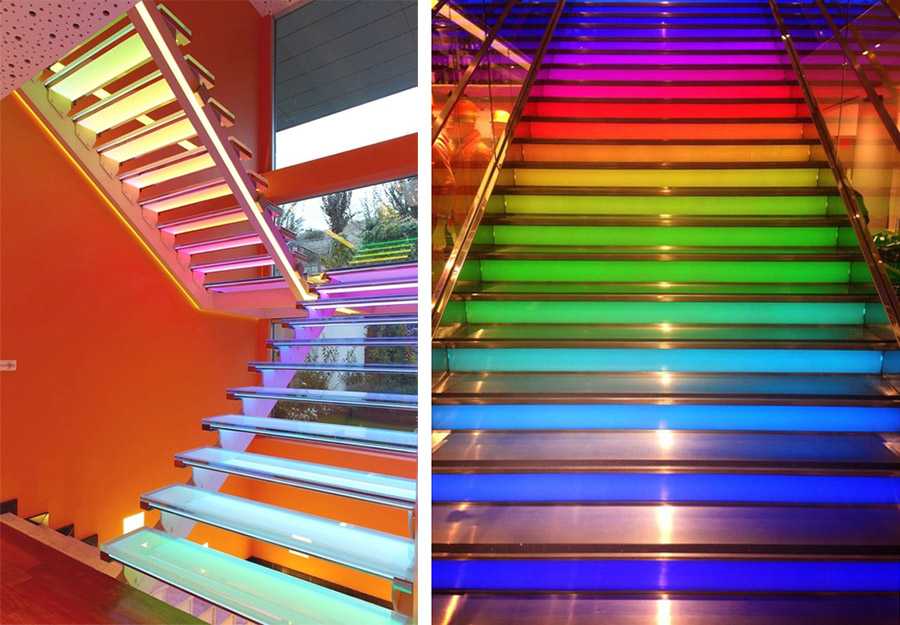 На видео: детальный обзор стеклянной лестницы и подсветка ступеней.