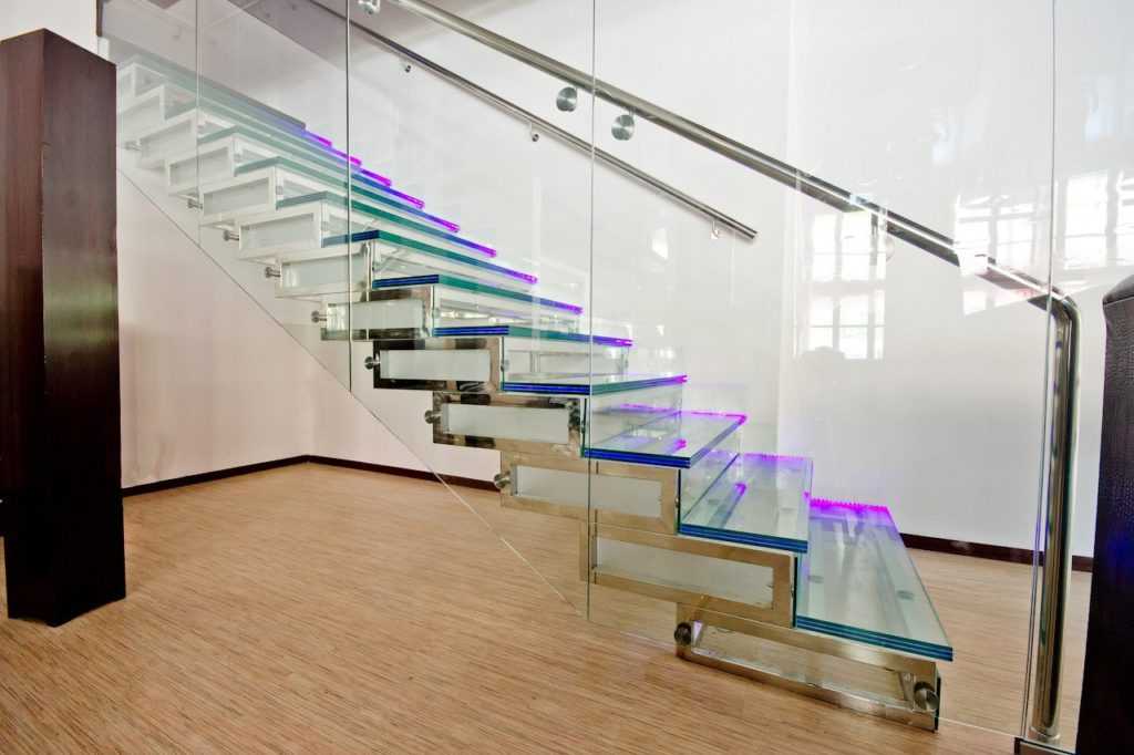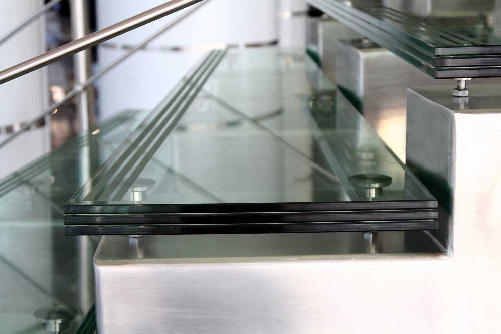 Лестницы со стеклянными ступенями выглядят очень стильно и необычно. Элементы конструкции изготавливаются из специально созданного для этих целей материала – триплекса. Материал представляет собой трёхслойное ударопрочное стекло, толщина которого может достигать 4 см.