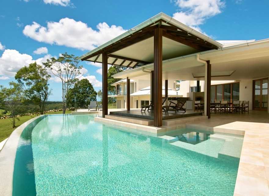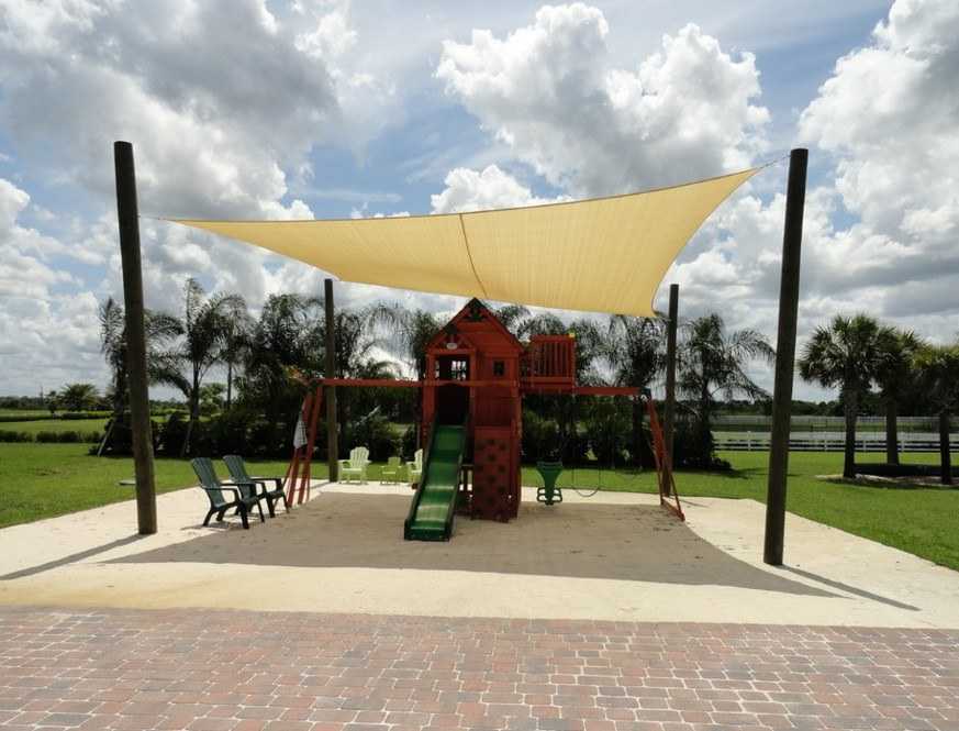 Конструкции виде тента обычно пристроены к дому, являясь навесом, накрывая стол, игровую площадку для детей или автомобиль. Создавая полутень в солнечную погоду, она не укрывает от дождя.