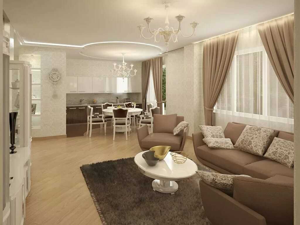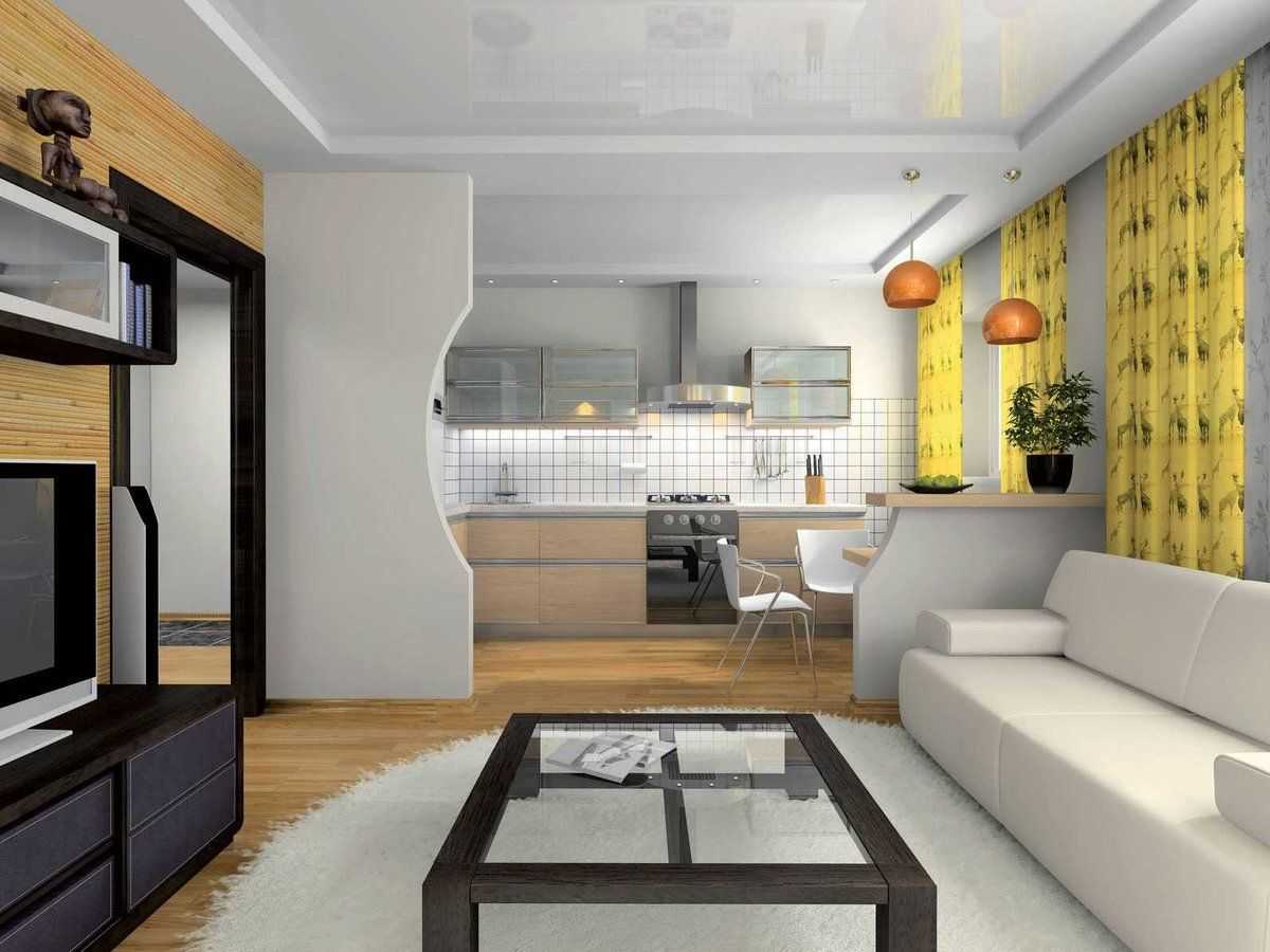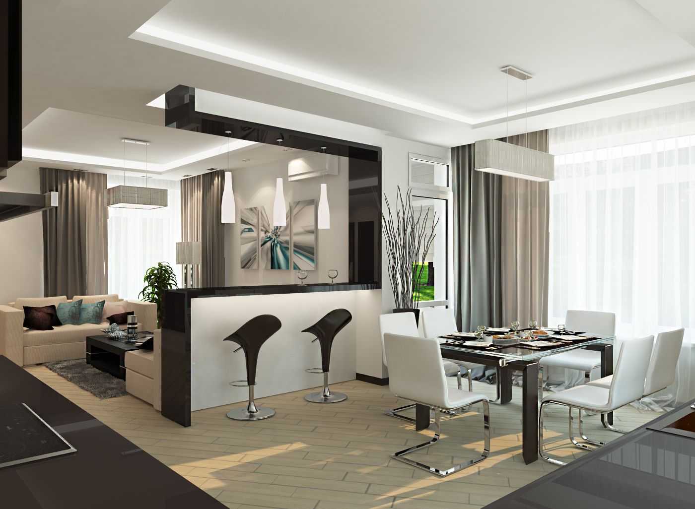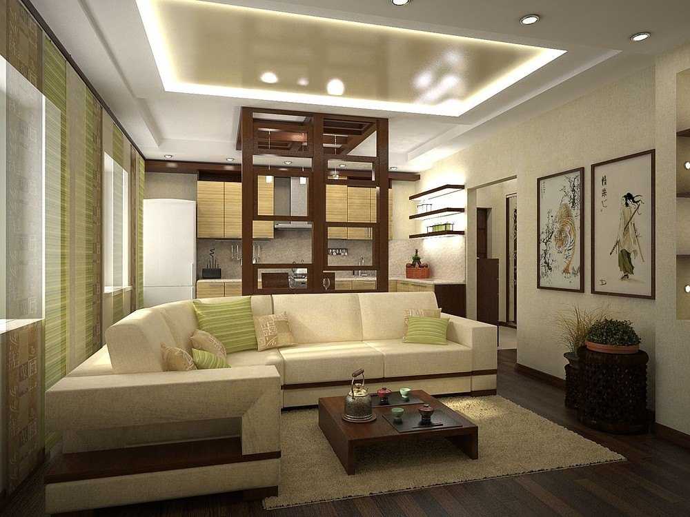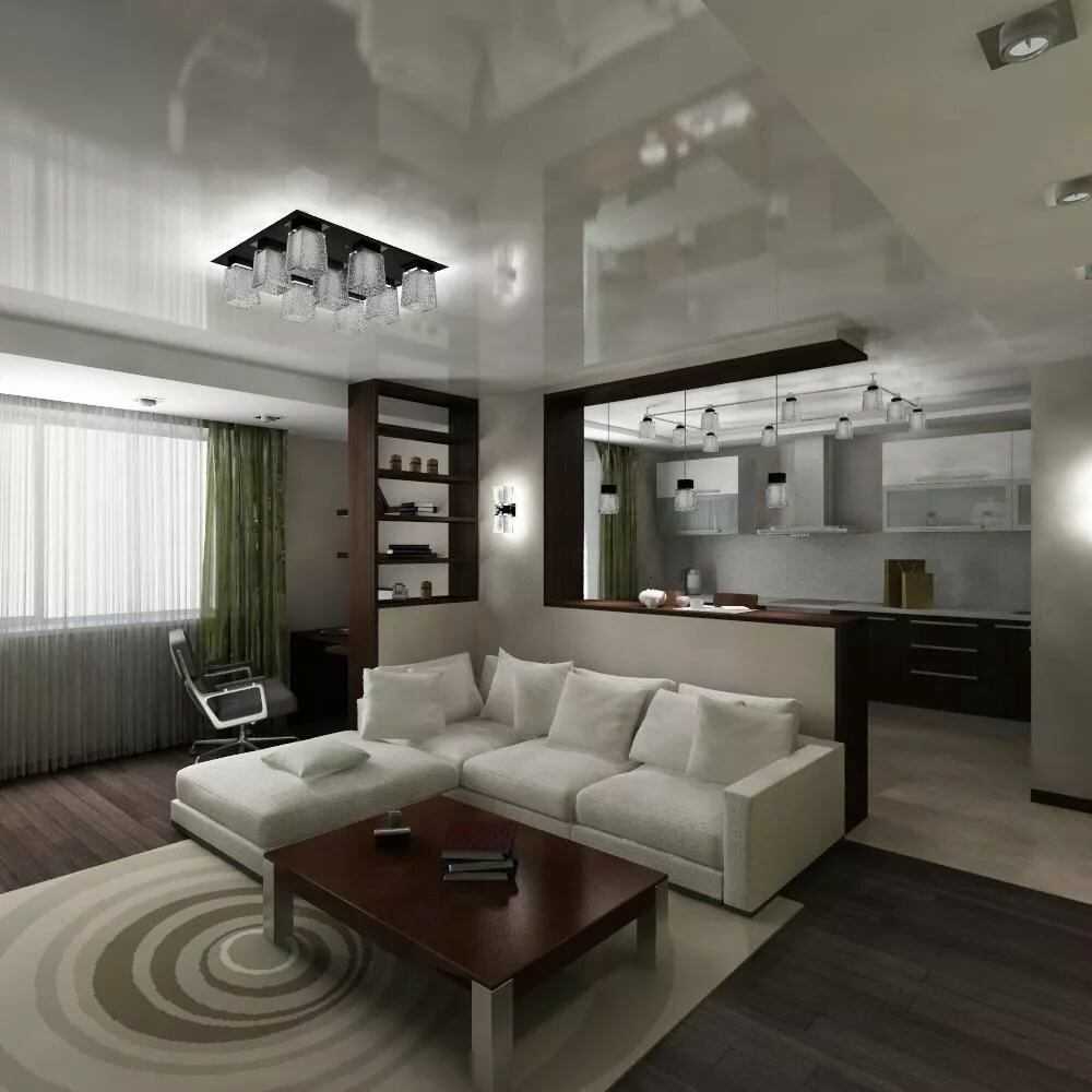 Оформление потолка чаще всего является цветовым продолжением стен, но есть и более современные варианты – комбинированные или двухуровневые потолки с ПВХ или сатиновыми полотнами. Глянцевое или фактурное покрытие гармонично дополнит кухонный гарнитур и обивку мягкой мебели в гостиной.