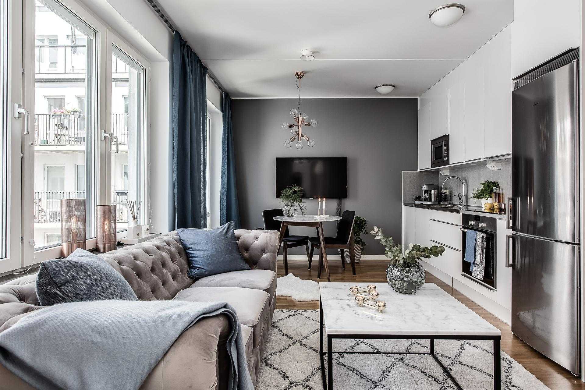 Невероятной популярностью в дизайнерских проектах пользуются скандинавские мотивы. Этот стиль имеет довольно много особенностей, что и делает его по-своему уникальным. Лаконичность оформления позволяет сохранить свободное пространство. Но в то же время такой интерьер точно будет создавать ощущение уюта для каждого члена семьи или гостя. В целом можно сказать, что скандинавский стиль немного схож с минимализмом. Он предполагает светлое, нейтральное оформление стен и мебели, а также большое количество естественного освещения. Такого эффекта можно достичь, есть отказаться от слишком плотных и темных штор. В гостиной они редко используются по назначению. Альтернативным решением могут быть рулонные шторы, тонкий тюль или даже жалюзи.