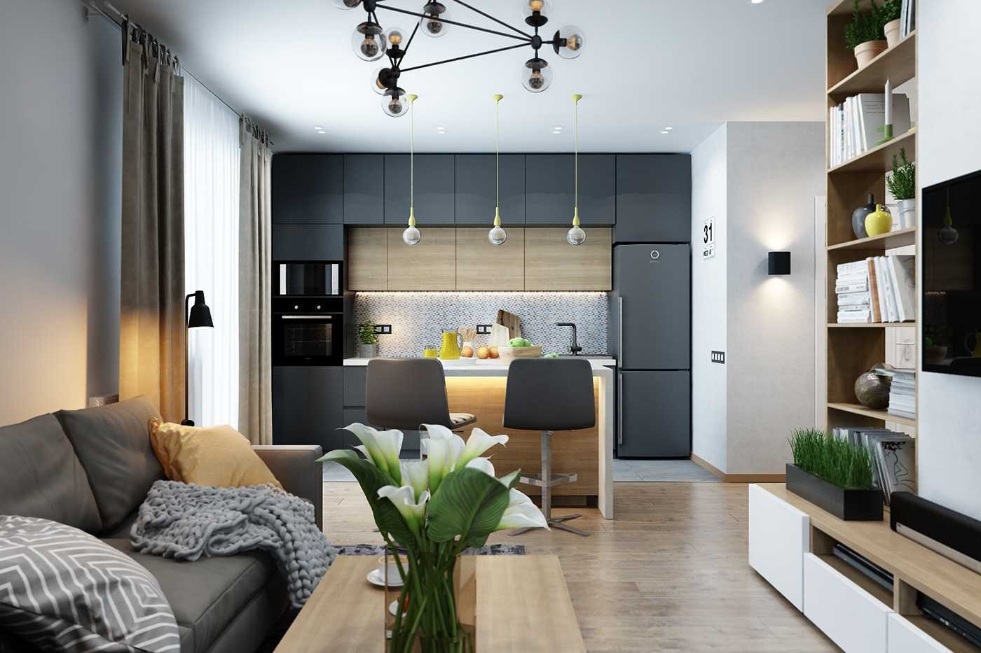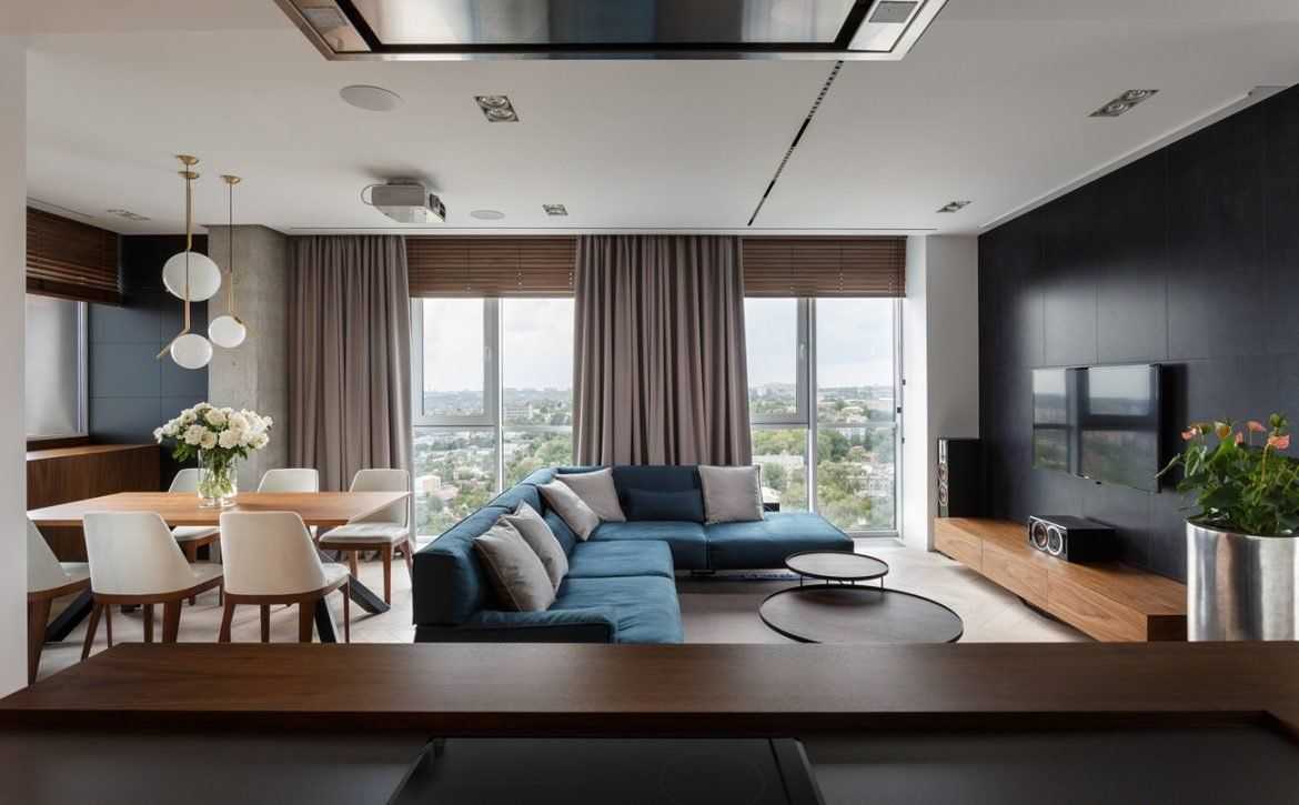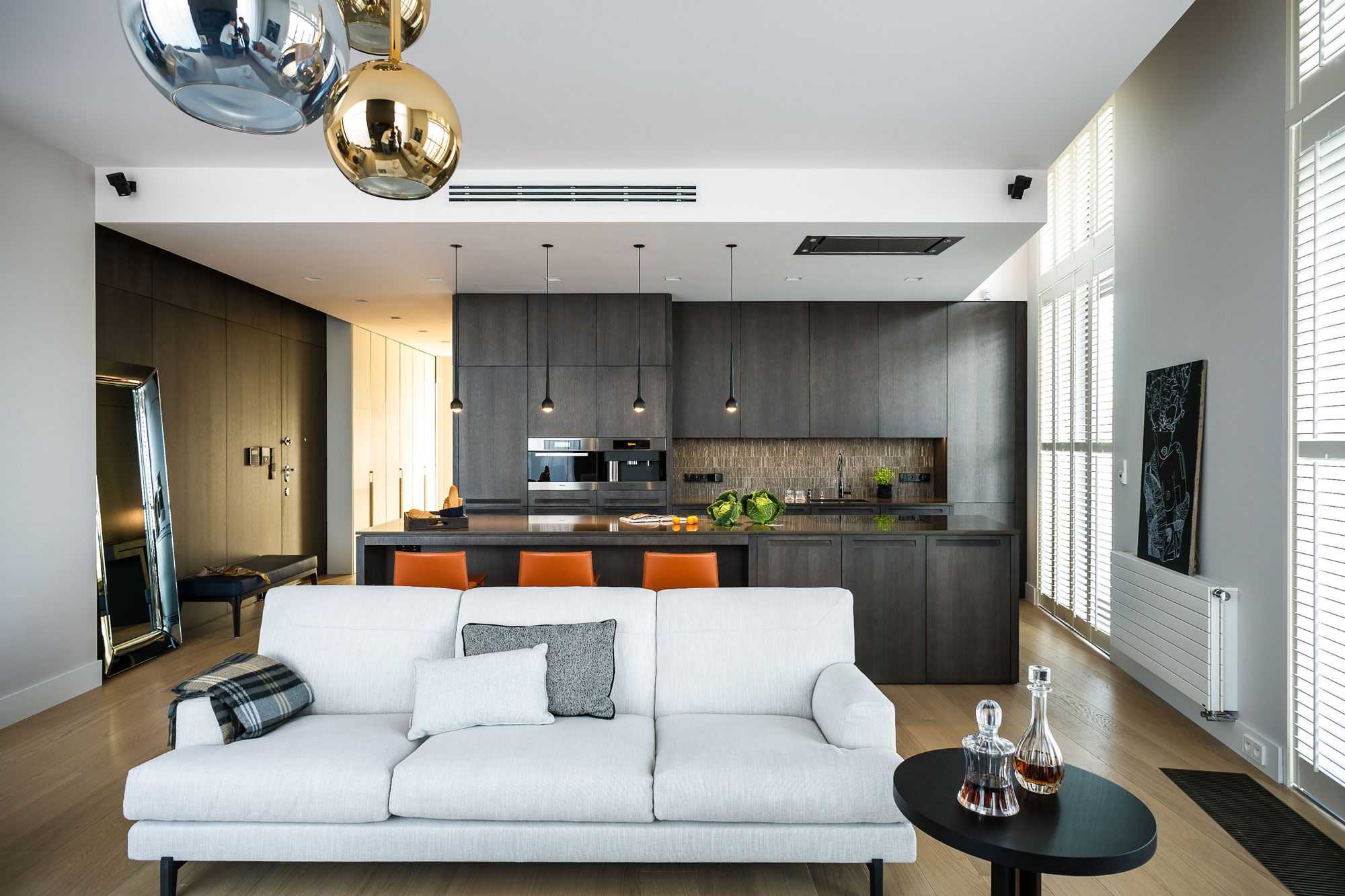Вторым основным фактором, определяющим стиль, считается большое пространство. Современные жилые комнаты в квартире обычно высокие. Перегрузка пространства мебелью исключена. Часто кухня совмещена с гостиной, чтобы набрать лишние метры. В таких случаях кухня может появиться как в виде пристройки, занимающей только одну стену, так и по договоренности с островом.