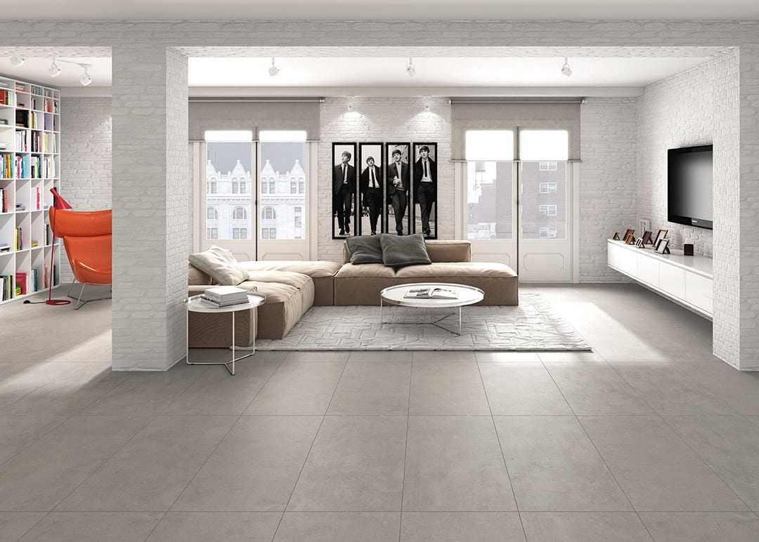 Серая плитка прекрасно подходит для напольного покрытия в гостиной современного стиля