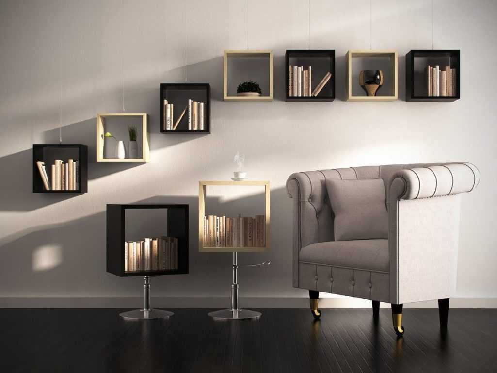 Стены, дополненные стандартными квадратными или классическими прямоугольными полочками, придают помещению стильный облик. Настенные конструкции в виде кубов очень часто изготавливают собственноручно.