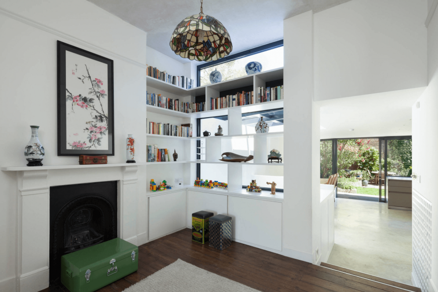 Вокруг стеллажа можно создать уютную зону отдыха для чтения любимых книг. Постелите пушистый ковер, установите удобное кресло и небольшой журнальный столик.