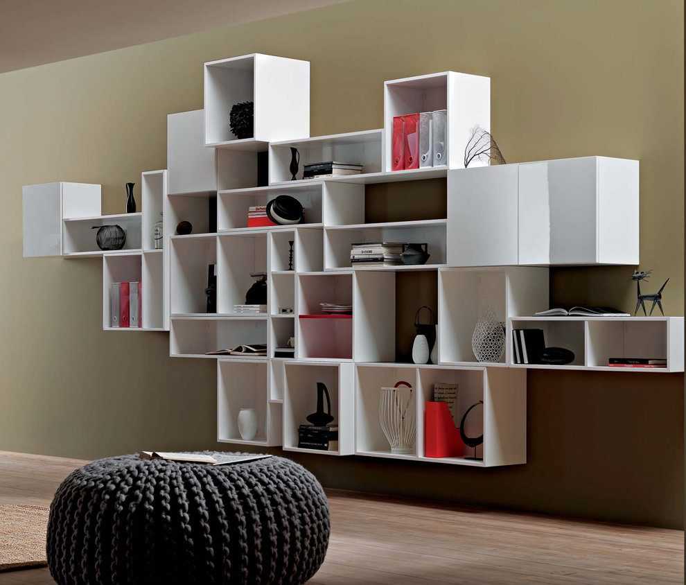 Модульная стенка с полками и стеллаж в интерьере гостиной