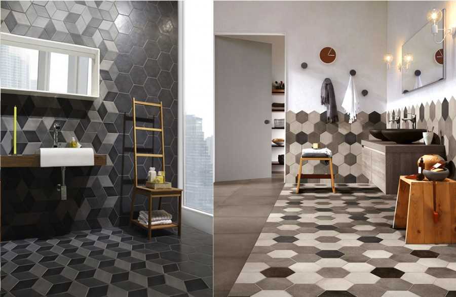 Торжество геометрии подтверждает и другой популярный вид плитки — ромбовидной. Шестиугольные фрагменты очень здорово подчеркивают приверженность линейной философии, но при этом преодолевают сдержанность и упорядоченность традиционных форм, предлагая дизайнерам бесконечное количество вариаций использования