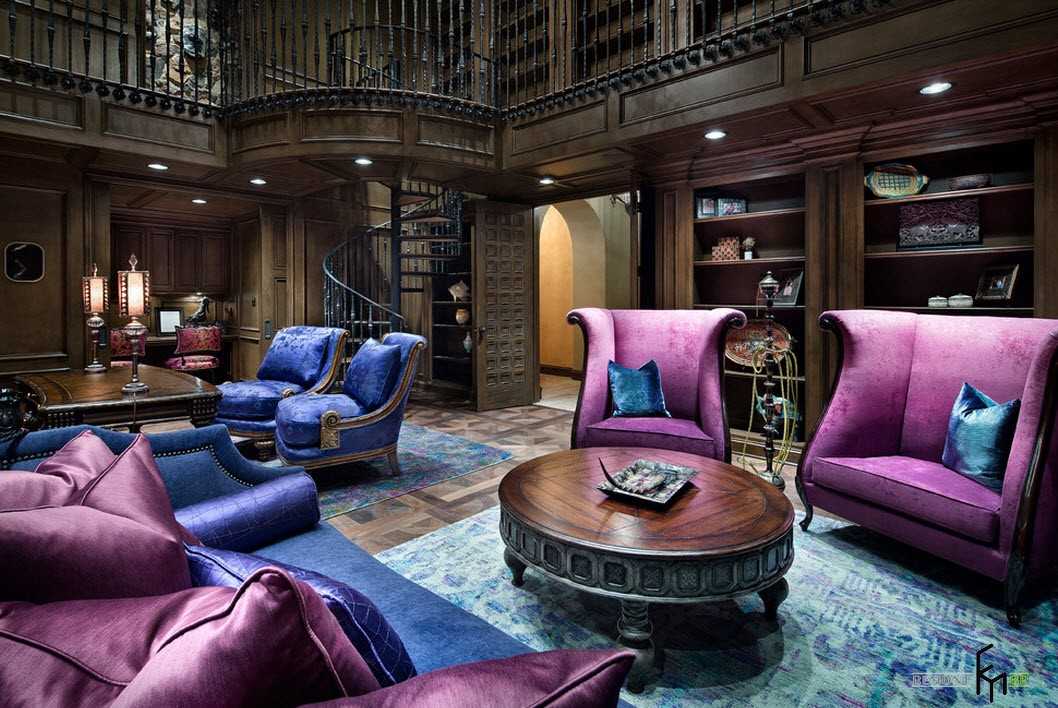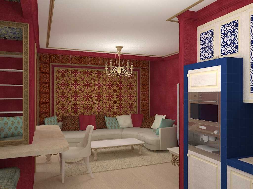 На полу уместна черно-белая плитка или разноцветная мозаика. Предметы интерьера могут быть выполнены в терракотовом, синем, зеленом, фиолетовом, лиловом и других ярких, насыщенных цветах. Хорошо, если будет много золотого и желтого цвета: в обшивке мебели и драпировках, в многочисленных деталях украшения.