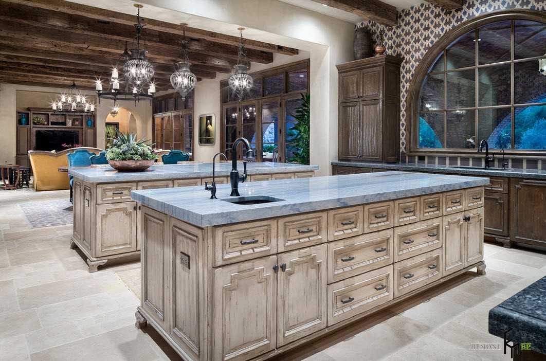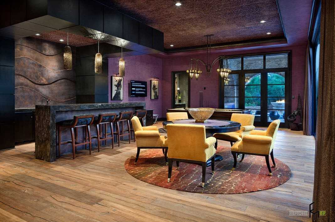 А в столовой дорогостоящая отделка мрамором или гранитом, мебель из дорогих пород дерева эффектно контрастирует с грубым дощатым полом: