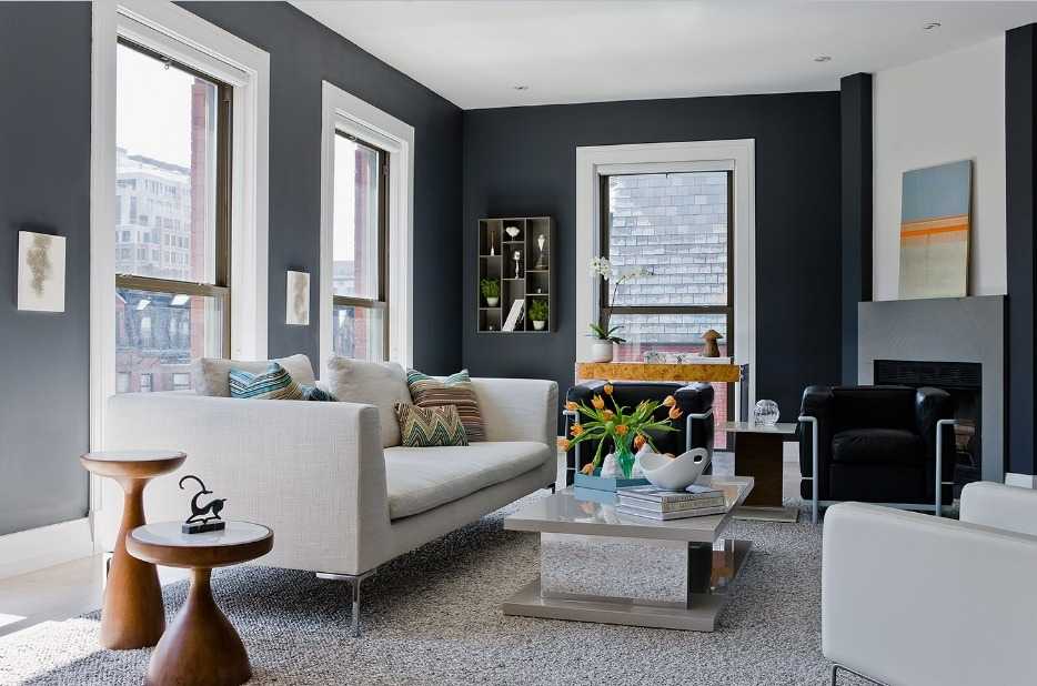- Выбор оттенка должен в первую очередь опираться на площадь гостиной. Чем меньше помещение, тем светлее оно должно быть. Только просторные комнаты могут позволить себе темно-серый цвет в качестве базы.