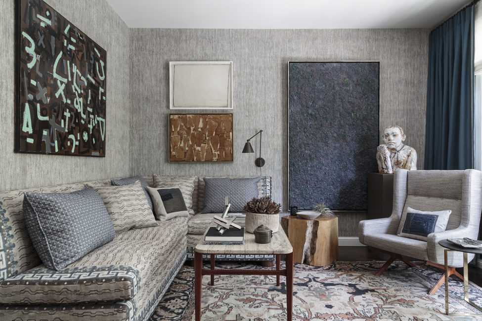 Сочетание серого и голубого цвета в интерьере современной гостиной