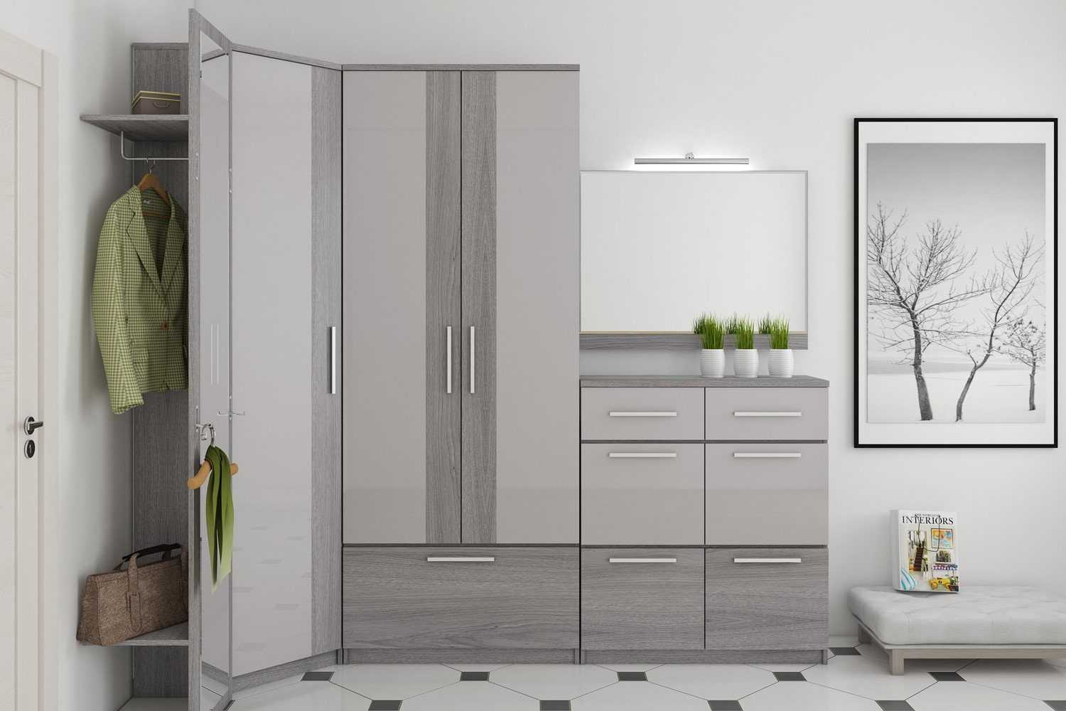Ищете предмет мебели, который выполняет сразу несколько функций? На рынке вы найдете интересные решения в виде шкафов, соединенных со скамейками с помощью стены, на которой уже есть вешалка и зеркало. Такой комплект идеально подойдет, если серая прихожая не слишком просторная, и вы хотите, чтобы она оставалась функциональной.