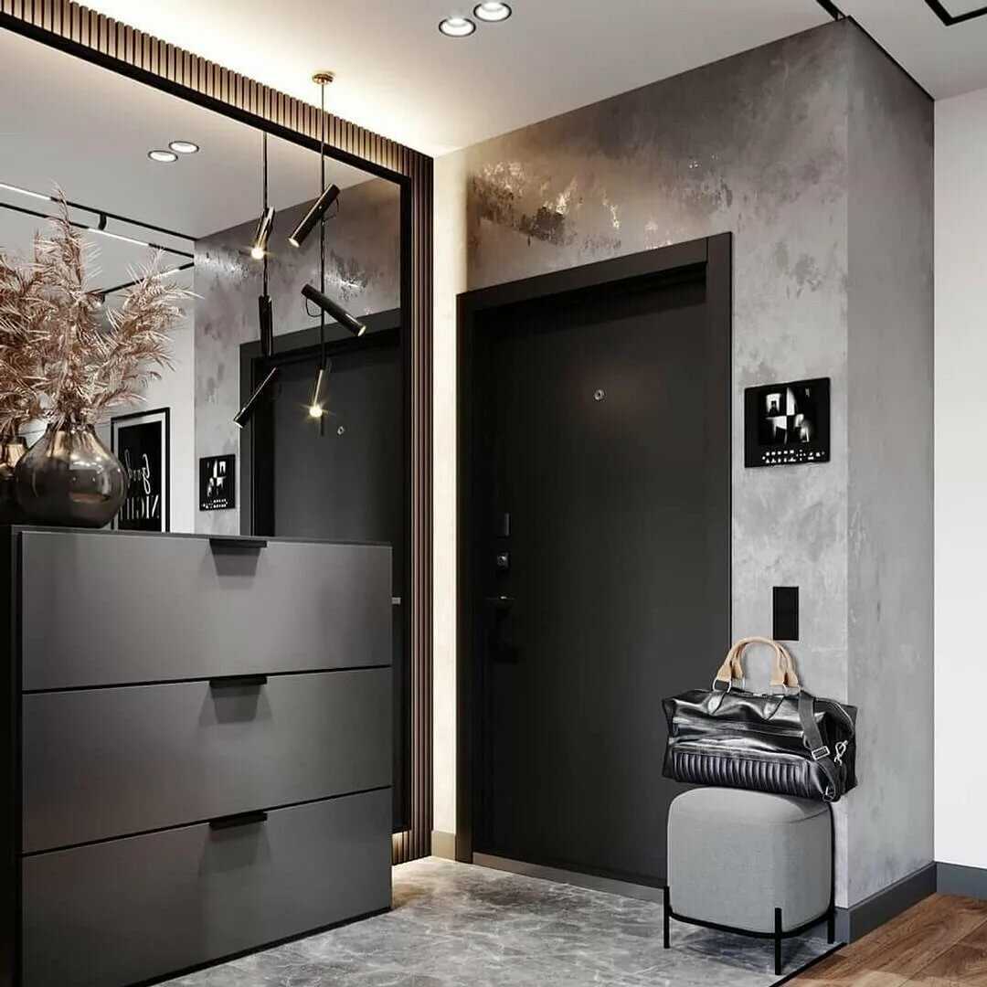 Если тебе повезло с большой и достаточно светлой прихожей или просторным объединенным помещением, смело бери черный цвет. Такие интерьеры всегда смотрятся дорого, стильно и эффектно, а на темном фоне по-новому играет деревянная мебель. Чтобы комната не была слишком мрачной, позаботься о светлых акцентах и достаточном количестве света.