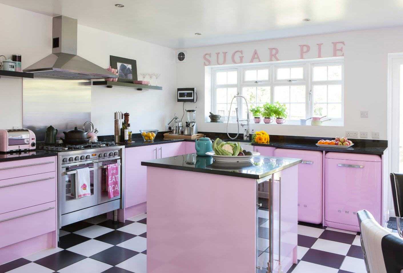 Классический современным гарнитур в такой палитре тоже заиграет абсолютно по новому. Глянцевые фасады цвета фуксия, солнечный матовый фартук. Никаких сложных приемов и мудреного декора — однако помещение выглядит симпатично и модно.