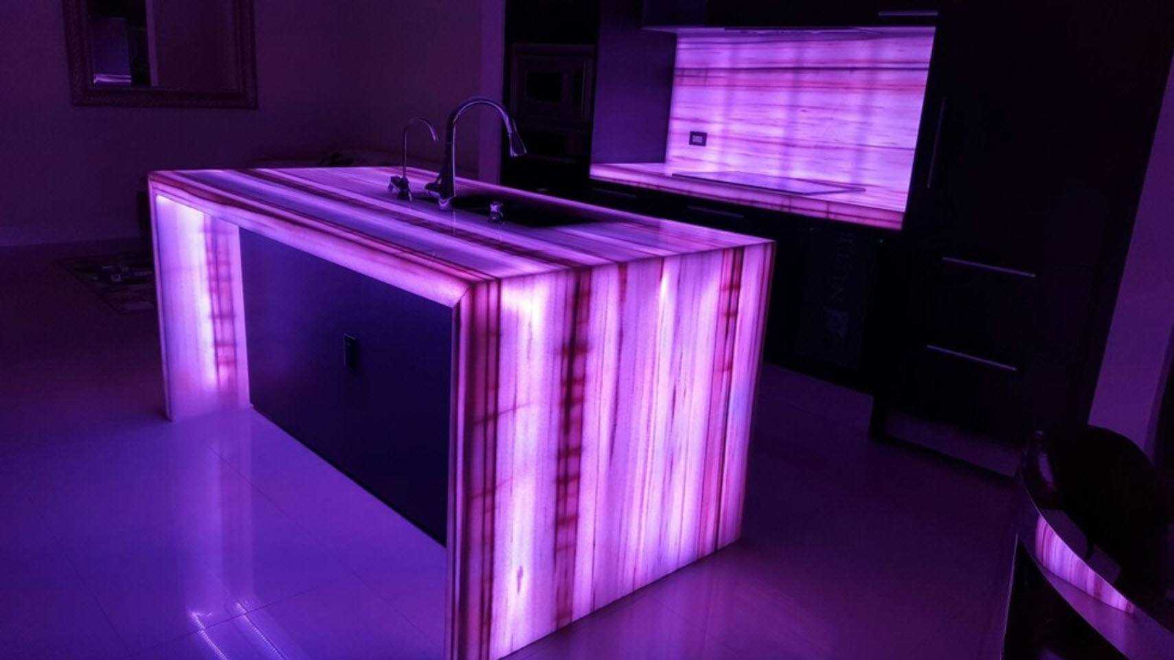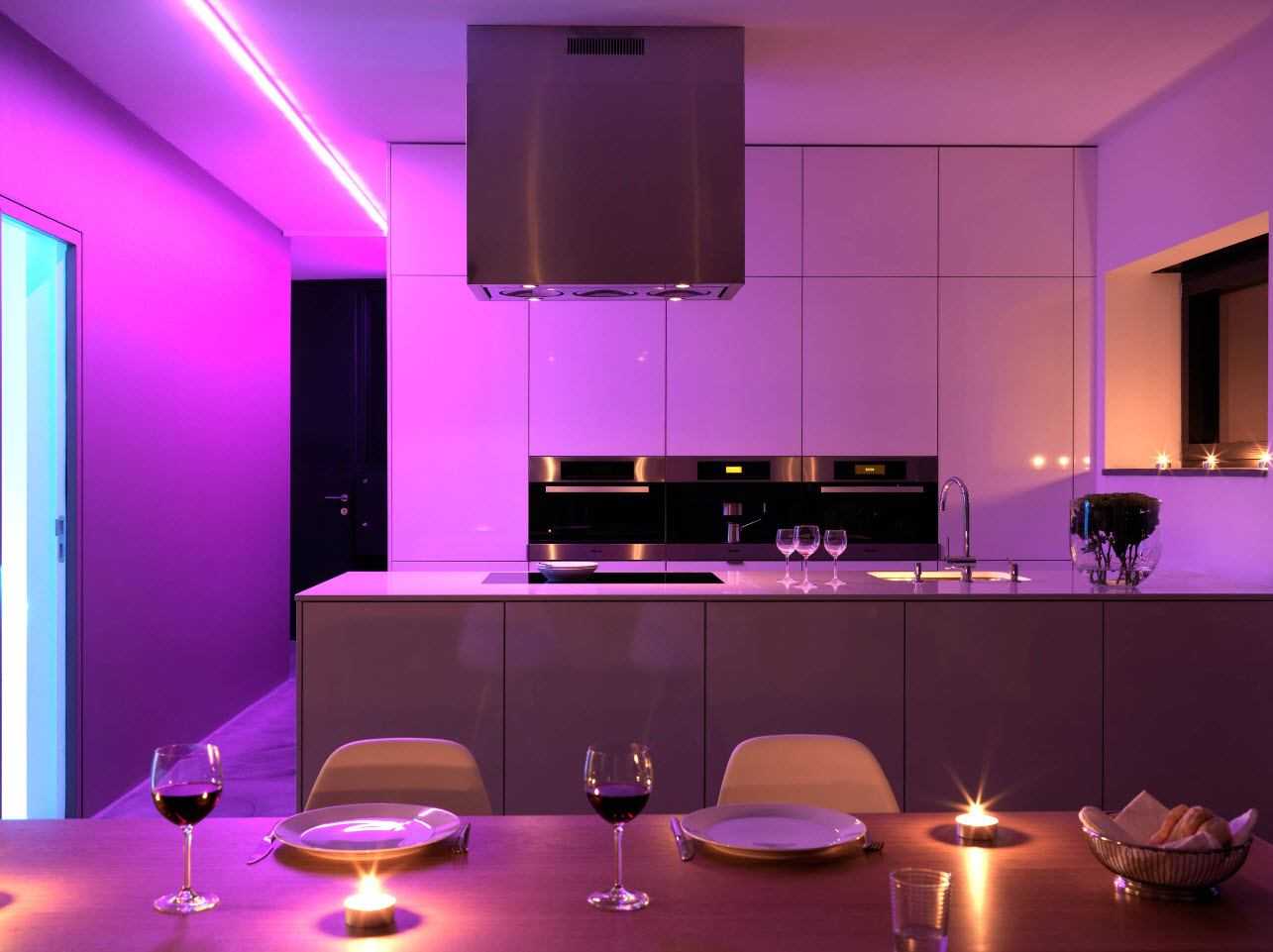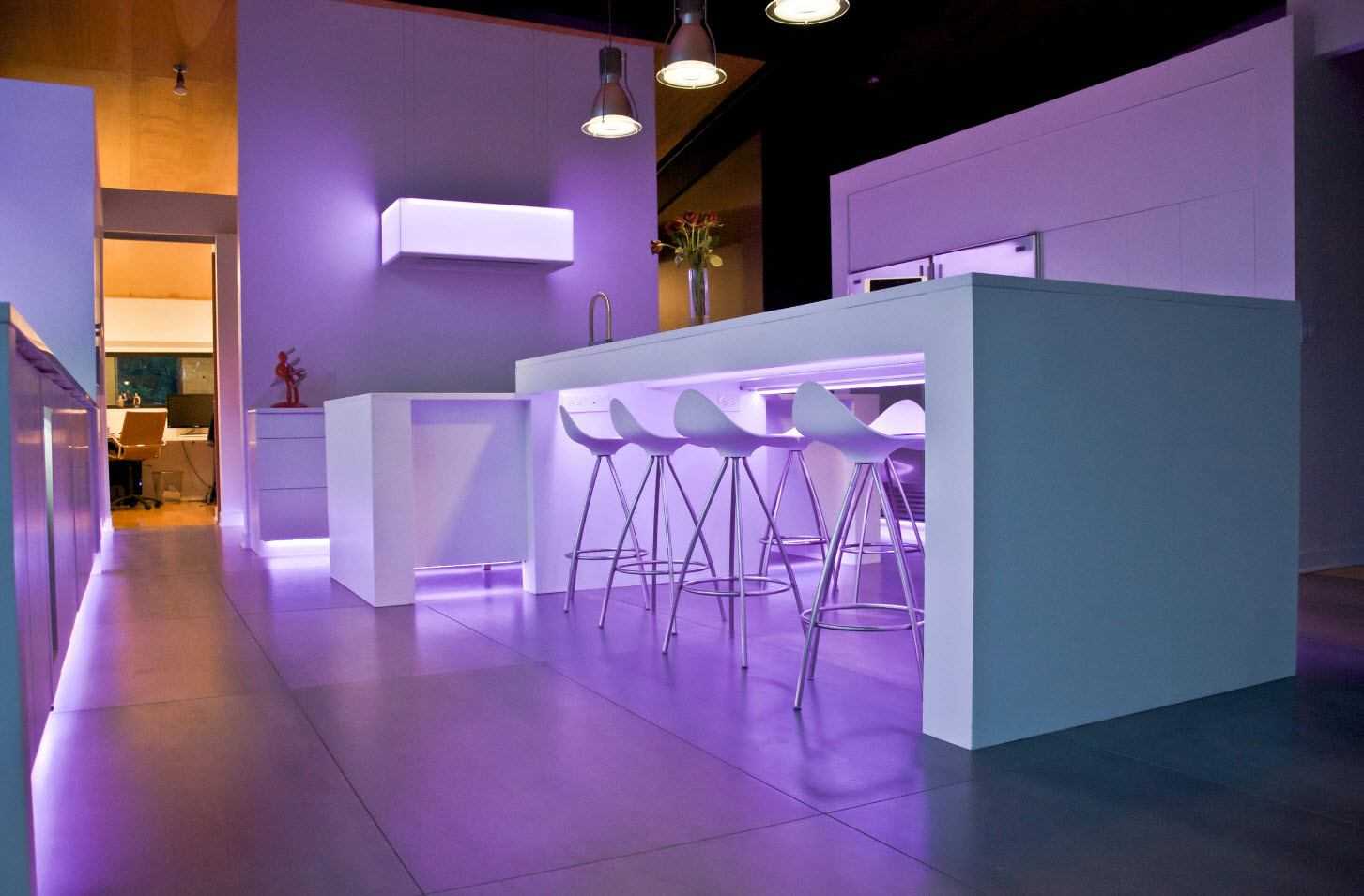 Освещение на кухне в бело-фиолетовых тонах
