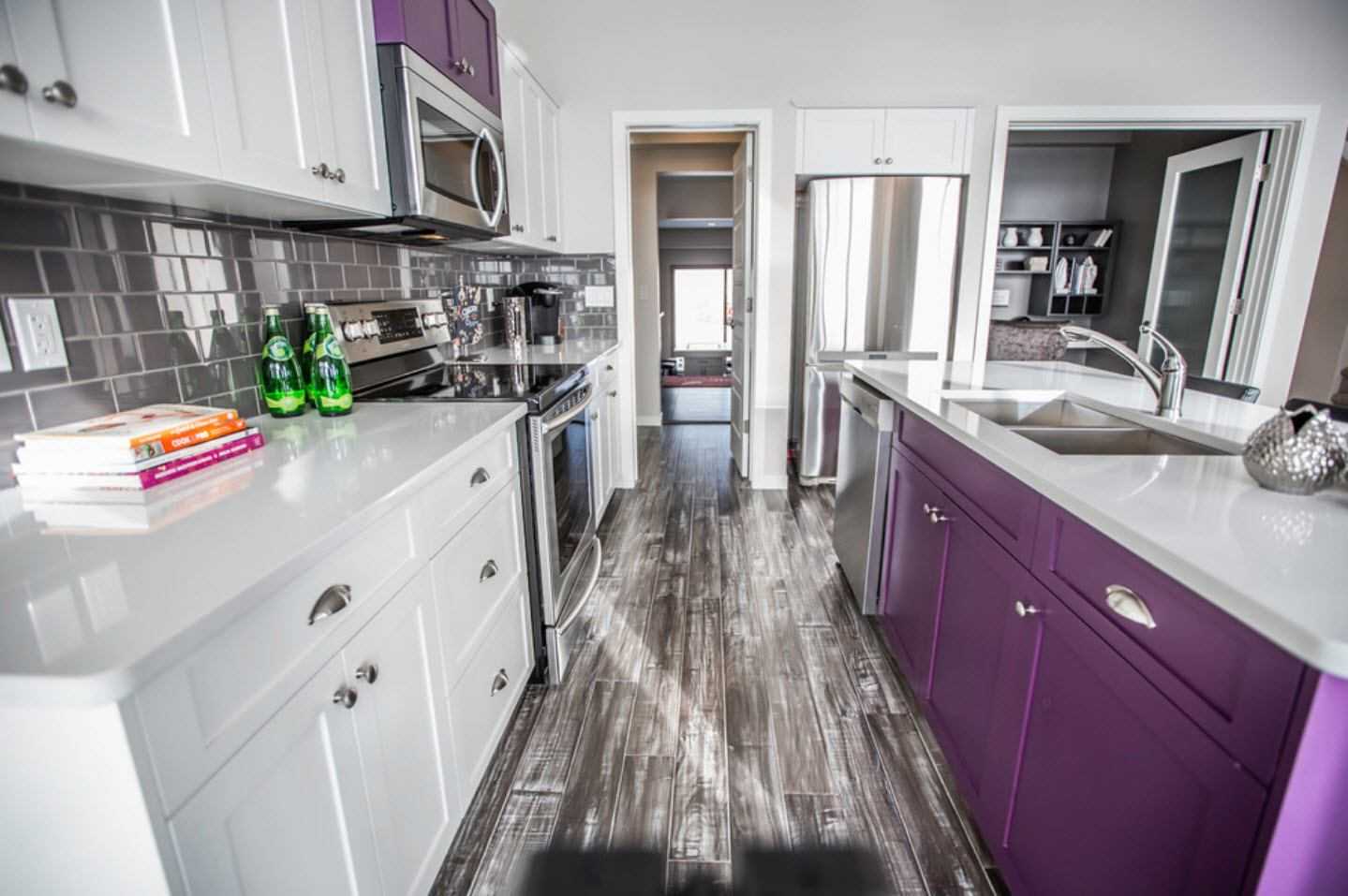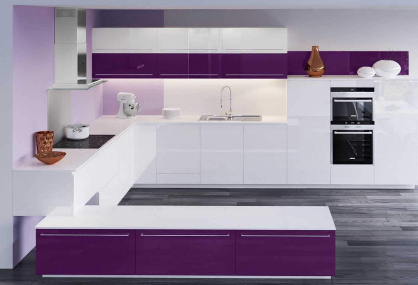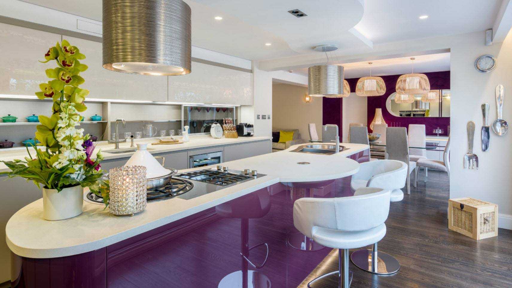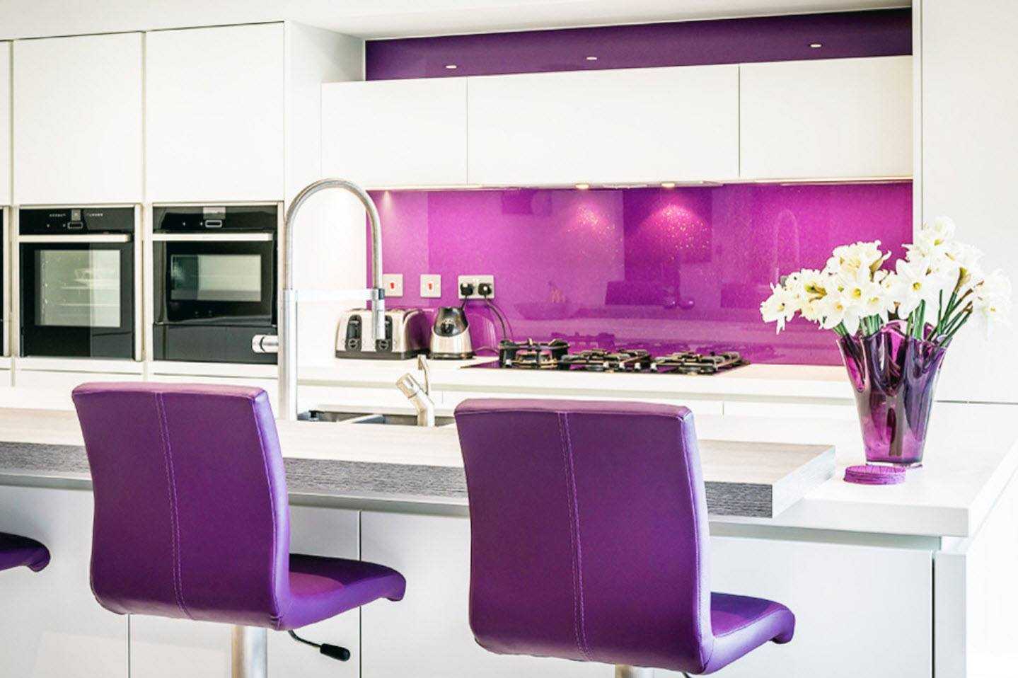 Как оформить кухню с белым и фиолетовым цветами
