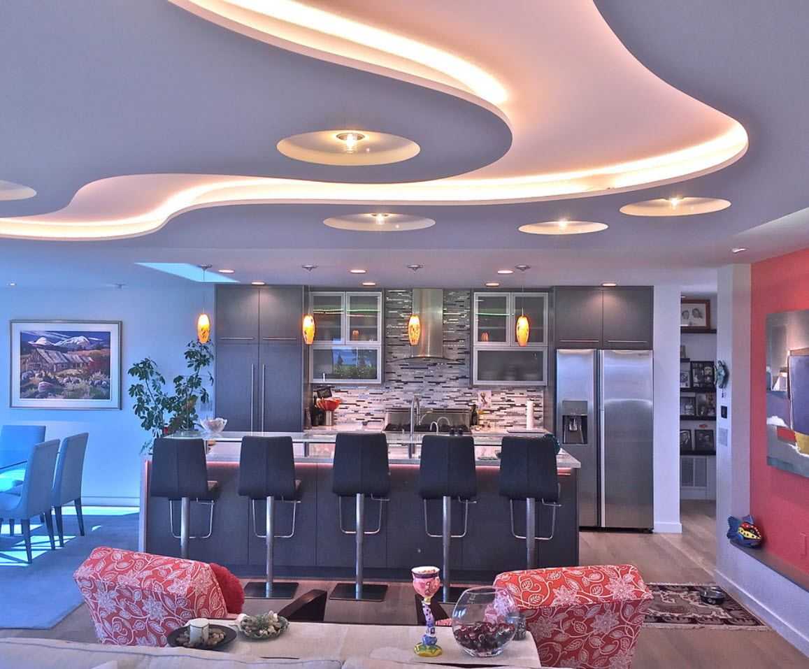 На кухне требуется яркое освещение, необходимое для комфортного приготовления пищи и трапезы. Для этой цели над обеденным столом подвешивают люстру, а в рабочей зоне размещают точечные встроенные или накладные светильники. В качестве дополнительных источников света можно установить точечные приборы по периметру потолка. Такие же элементы можно встроить в мебель, ниши и другие области.