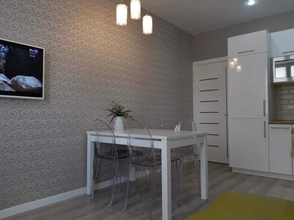 Стильным акцентом выступит варочная поверхность и духовой шкаф. Дополните их вытяжкой угольно-черного цвета. Для разбавления монохромной гаммы в других углах комнаты повесьте световые приборы светло-зеленого цвета. Один светильник можно разместить над столом, а второй над барной стойкой. Сделайте так, чтобы они перекликались со стульями в такой же палитре.