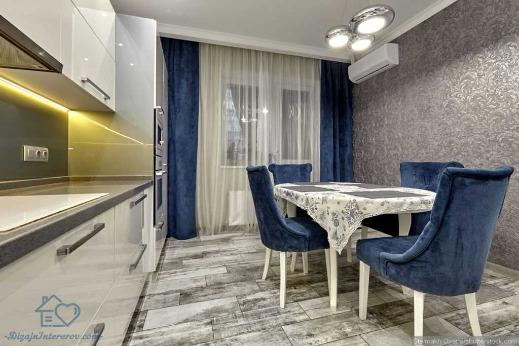 Обстановка кухни всегда выигрывает, когда наблюдается сочетание предметов. Например: синий цвет кухонного фартука перекликается с синей обивкой стульев (либо синей вазой).