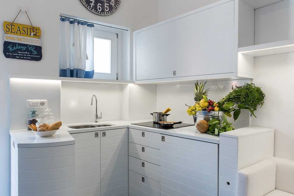 Например, белая кухня с белым фартуком смотрится эффектно и стильно. Сейчас популярно применение монохромности, поэтому сочетание не покажется скучным. Его разбавляют яркими аксессуарами, текстилем, комнатными растениями.