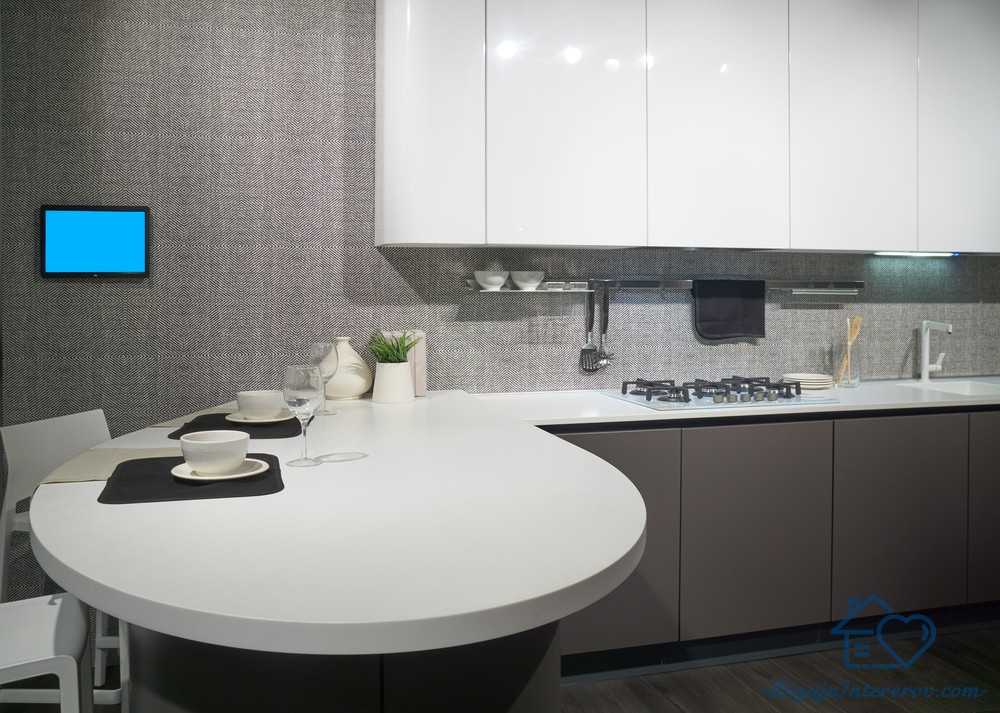 Например, фон кухни формируется из двух цветов: белого и черного, матового и глянцевого. В данном случае, к белому матовому гарнитуру подбирается черный глянцевый фартук. При этом выполняется в белом цвете потолок, а стены и пол выполняются в темном цвете.