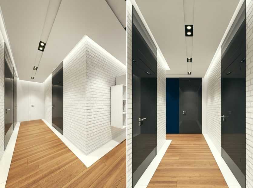 Очень редко встречается способ настенного размещения светильников в коридоре. Для этого он должен быть достаточно широким, чтобы осветительные приборы не сужали его визуально.