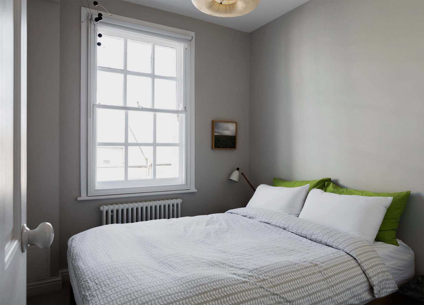 Поворачиваемые светильники у изголовья кровати могут полностью заменить верхнее освещение в маленькой спальне, а встроенные ниши в стене могут заменить прикроватные тумбочки.