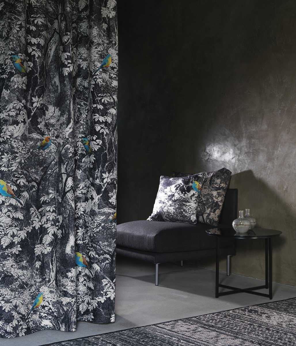 Льняная занавеска предлагает принт в тропическом стиле. На черном фоне декор природы выделяется белым, акцентированным животным мотивом с прикосновениями кричащих цветов. Такая штора принесет вам ультрасовременную ноту и рок-н-ролл для интерьера спальни.