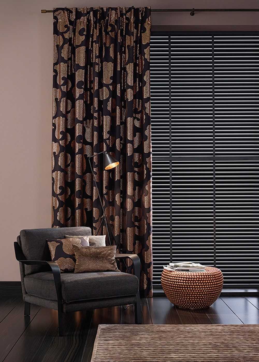 Металлизированная штора с интенсивной коричневой расцветкой и повторяющими принтами адаптируется к теплым и сложным украшениям спальни. Идеально подходит для уютной атмосферы, интимно озаряя комнату сверкающим эффектом ткани.