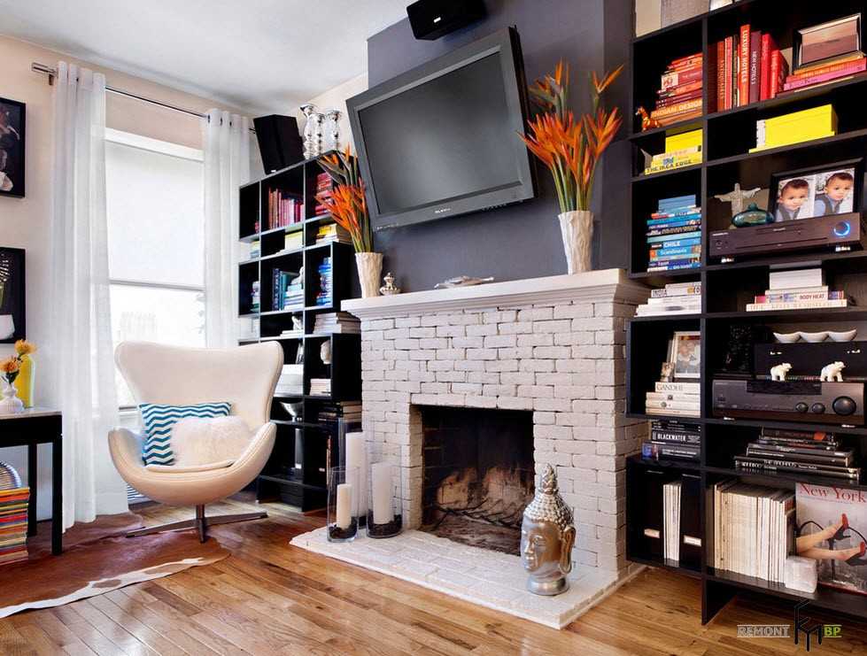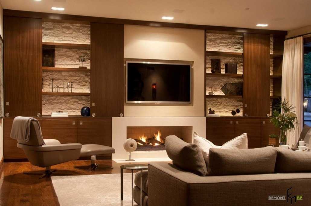 Противоречивый вариант – расположить ТВ над камином. В данном случае монитор окажется выше уровня глаз, что не совсем комфортно для просмотра. Поэтому принять решение необходимо заранее, на этапе планировки.