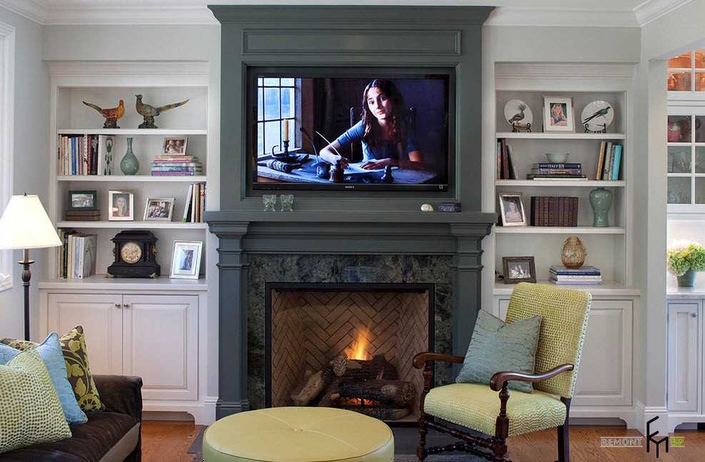 Камин в гостиной чаще всего является основным акцентом ее интерьера. Как правило, это завершающий элемент классического стиля. На первый взгляд кажется, что телевизору в такой аристократической обстановке и вовсе не место, но в современном дизайне нет ничего невозможного.